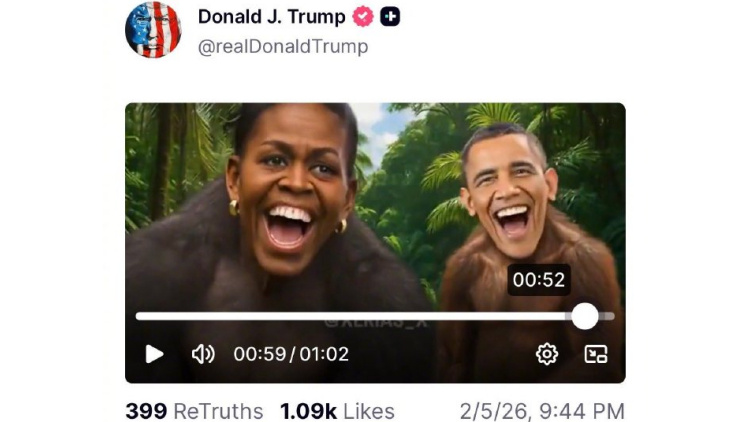 特朗普社交媒体账号发布一段将奥巴马夫妇面部与猴子拼接的视频,被指涉嫌种族歧视。白宫起初辩称无冒犯之意,后删除并称员工误发。美国有色人种协进会主席谴责视频卑鄙且令人作呕。前副总统哈里斯批评白宫欲盖弥彰。此事引发广泛不满,舆论质疑白宫态度,选民称将在投票时记住这一事件。