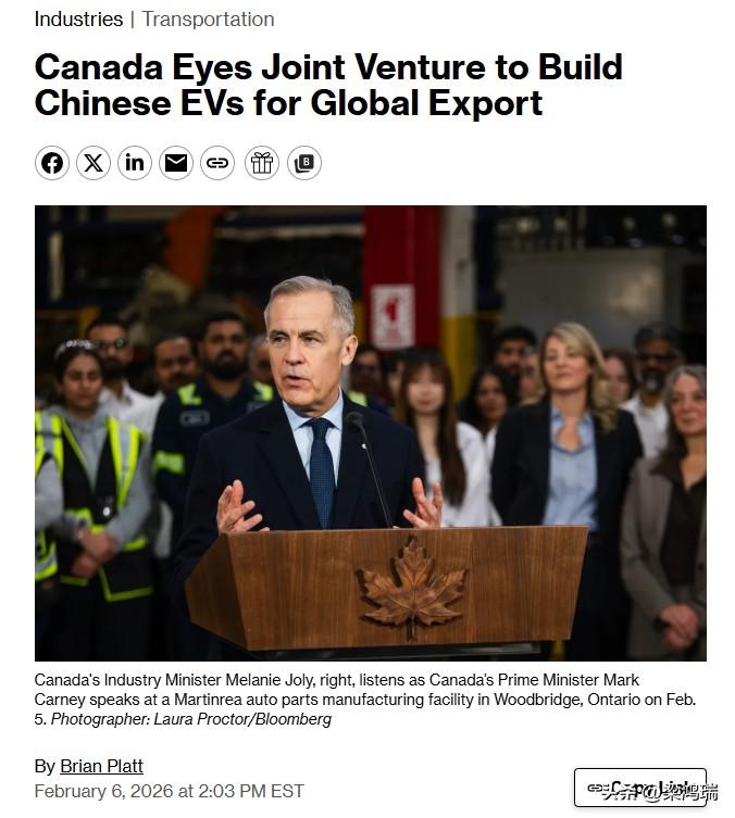 加拿大工业部长梅拉妮·乔利称,加拿大正推动引入中加合资电动车组装厂,在加拿大生产并面向全球出口;麦格纳(Magna)、利纳马(Linamar)、马丁瑞亚(Martinrea)等加拿大零部件巨头或参与合作。此举被视为加方立场大转向,意在降低对美国汽车市场依赖、壮大本土产业。