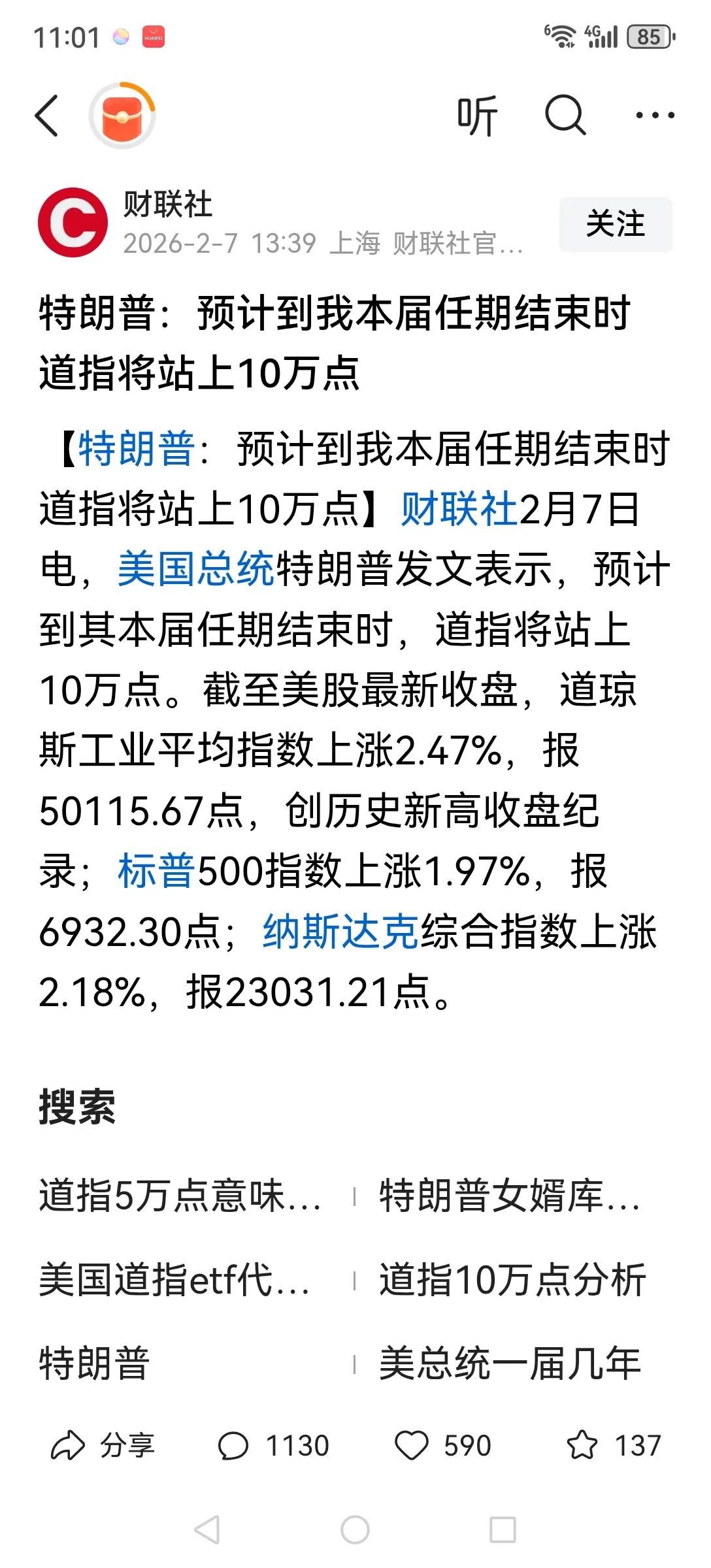川普说:任期结束时道指将站上10万点,也就是两年来道指再翻一倍,你信不信?