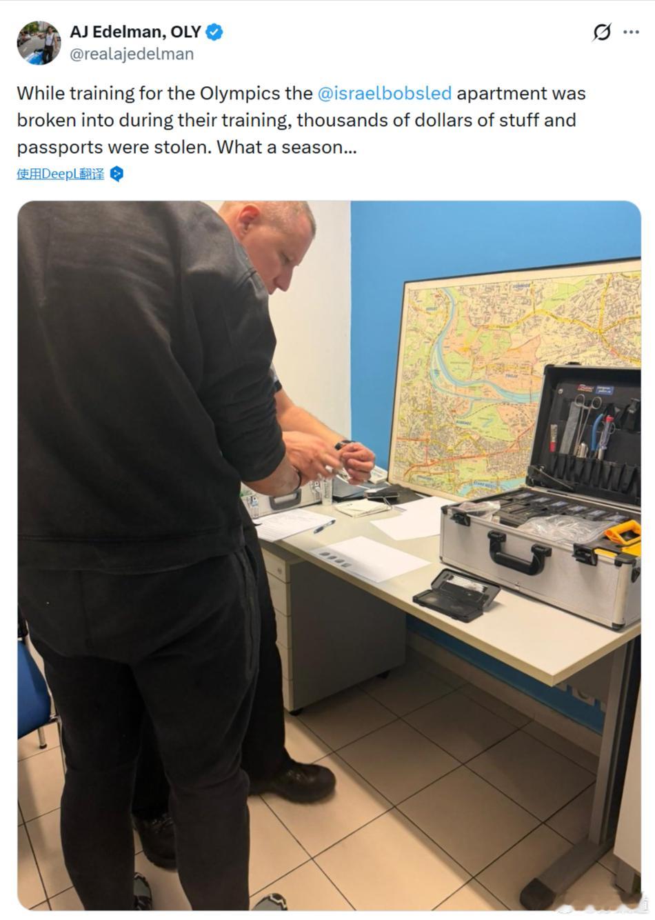 以色列雪车队的舵手亚当·埃德尔曼于8日通过个人社交媒体发文称:“我们作为训练宿舍使用的公寓遭小偷闯入,价值数千美元的财物以及护照被盗。这一赛季真是多灾多难……”