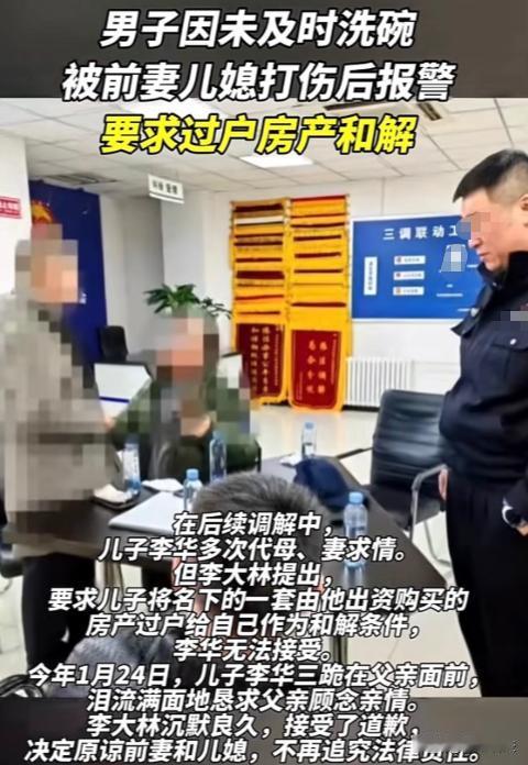 离了个大谱!黑龙江大庆,有这样一对老夫妻,他们的离婚已经15年了,可就是因为帮着前妻带小孙子这点子小事,竟还是同住一块儿!。不料一场因酒后没及时洗碗而起的家庭矛盾,演变成前妻、儿媳三方不和的大打出手,男子不仅身受了重伤,还气得直接将二人送进了警局要追究他们的责任。儿子坐不住了,赶忙求父亲高抬贵手,放过母亲和妻子。可父亲提出条件,让儿子把名下唯一一套房子过户给他,但没想到,儿子却一口回绝了父亲的要求,还给父亲下跪了三次,哽咽着求了父亲三次原谅,最终的结局却让人意想不到…… 李大林和王丽,曾经携手走过一段婚姻,却因性格不合在15年前分道扬镳。 儿子李华成家有了孩子后,小两口工作忙,可为了帮儿子李华带孙子,这么多年一直住在一块,照顾孙子的重任就落在了他们身上。 2025年12月的一个晚上,李大林忙活了一天,晚饭时多喝了几杯,酒意上头,吃完饭就歪在沙发上打盹。儿媳收拾厨房,看到水池里堆着没洗的碗,顿时火冒三丈。 儿媳本就是个急性子,平时对李大林一些生活习惯就颇有微词,这下更是忍不住,几步走到沙发前,大声数落起来:爸,您怎么又不洗碗,这家里又不是只有您一个人,不能什么事都指望我们吧! 儿媳妇认为,李大林作为长辈,本就该以身作则,这碗不洗,乱糟糟的不像样子,王丽听到儿媳的数落,也跟着指责李大林,说他一天到晚就知道喝酒,家里的事一点都不操心。 李大林本就喝了酒,头晕乎乎的,被两人这么一指责,借着酒劲就吵了起来:我怎么不懂事了,不就几个碗没洗嘛,至于这么上纲上线吗! 双方谁也不肯让步,情绪越来越激动,最后竟然动起手来,混乱中李大林的脸上挂了彩,他掏出手机就报了警。 很快,民警了解情况后告诉李大林,要是他的伤情没到轻伤以上,这事就归治安管理,而且会先进行调解,在调解过程中,李大林有主导权,能决定谅不谅解对方,也能提和解条件。 李大林提出一个条件,让儿子把名下的房子,过户到自己名下,因为当时的首付也是李大林出的钱,现在过给自己也合理。 他儿子李华也闻讯赶来,夹在中间却一边要受父亲的气,一边又要受相濡以沫的妻子和含辛茹苦的母亲的唠叨之苦。若不妥善的处理了这件事,一旦闹大了怕就把我们这个家给拆散了。 李大林和前妻、儿媳打架,要是李大林伤情没到轻伤以上,到底该怎么处理呢? 依据《治安管理处罚法》第9条的规定,对于因民间纠纷引起的打架斗殴等违反治安管理行为,情节较轻的,公安机关可以调解处理。经调解,当事人达成协议的,不予处罚。 李大林和前妻、儿媳是因为家庭琐事引发的打架,属于民间纠纷,会先进行调解,在调解过程中,李大林作为受害者,有着主导权,他可以决定是否谅解前妻和儿媳,也能提出和解条件,就像他要房产过户这种情况。 如果李大林坚持不谅解,前妻和儿媳就可能面临治安处罚。 根据《治安管理处罚法》第43条,殴打他人的,或者故意伤害他人身体的,处五日以上十日以下拘留,并处二百元以上五百元以下罚款;情节较轻的,处五日以下拘留或者五百元以下罚款。 不过,要是李大林伤情达到了轻伤以上,那性质就变了,这就涉及到刑事犯罪了。 根据《刑法》第234条,故意伤害他人身体的,处三年以下有期徒刑、拘役或者管制。 从这件事能看出,家庭矛盾处理不好,很容易引发大麻烦,很多家庭都存在类似的矛盾,大家总觉得是一家人,说话做事就不注意分寸,结果把小矛盾变成了大冲突。 1月24号,李华思来想去,决定向父亲下跪求原谅,他来到父亲面前,扑通一声跪下,眼中满是哀求:爸,您就别追究了,这事是我不对,没处理好家里的关系,可房子要是给了您,我们一家人就没地方住了,您就高抬贵手吧。 说完,李华又连续跪了两次,额头重重地磕在地上,李大林看着儿子,他想起这些年,自己虽然和王丽离婚了,但为了儿子,为了孙子,一直在这个家里操劳。 他也知道,儿子不容易,压力也很大,要是真把房子要过来,儿子一家确实会陷入困境,想到这里,李大林的心也软了下来。 最终,李大林放弃了追责和要房的想法,他看着儿子说:起来吧,爸不追究了,一家人过日子,哪能没个磕磕绊绊的,以后都好好的过吧。 对此,大家都怎么看呢,一起来讨论一下吧!