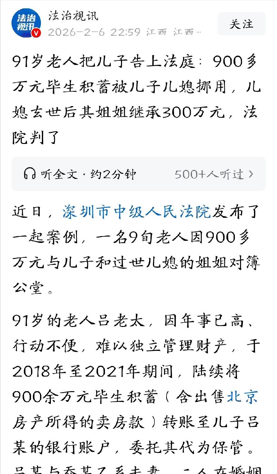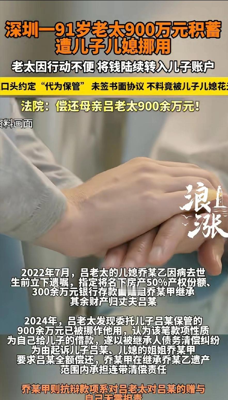 [中国赞]2月6日,这就是养儿防老?广东深圳,91岁老太年龄大了,怕自己突然老糊涂,就将900多万积蓄全部转给儿子,由儿子代为保管。本想着儿子是最靠得住的,谁知,儿子儿媳竟瞒着她,用这笔钱还了自家房贷,装修了房子。更可气的是,儿媳突然去世,还立下遗嘱,将其中的300万给了自己的姐姐。得知真相后,老太婆暴怒,她没想到儿子如此自私糊涂,一纸诉状将儿子和儿媳的姐姐告上法庭,要求全额还钱。 (信源:法治视讯) 平静的日子没能持续太久,2022年,乔某突发疾病去世。让人意外的是,她去世前立下自书遗嘱,指定将自己名下50%房产份额,以及从吕老太那里挪用的300多万存款,留给自己的姐姐乔某甲,剩余财产归吕某所有。 乔某甲欣然接受遗嘱,丝毫没意识到,这笔钱根本不是妹妹夫妇的私有财产,而是吕老太委托保管的养老钱。 吕老太对此一无所知,依旧安稳度日,直到2024年,她身体突然变差,常年被病痛困扰,需要大量钱治病、请护工,这才想起交给儿子保管的900多万。可当她小心翼翼提出支取部分钱时,吕某却总是支支吾吾、找借口推脱,这反常举动瞬间让吕老太起了疑心。 在吕老太的反复追问、步步紧逼下,吕某再也瞒不住,吞吞吐吐说出真相:那900多万早已被他和乔某挥霍一空,如今账户里所剩无几。 得知真相的吕老太如遭雷击、怒不可遏。她怎么也不敢相信,自己倾尽信任的儿子,竟会背叛自己、挪用养老钱;更让她心寒的是,儿媳竟将挪用的钱当作私产留给其姐姐。 一辈子的心血付诸东流,晚年治病都成难题,绝望之下,吕老太将吕某、乔某甲一并告上法庭,要求二人全额返还900多万积蓄。 法庭上双方各执一词:乔某甲辩解,吕老太转给吕某的钱是自愿赠与,属于夫妻共同财产,乔某有权立遗嘱将部分留给自己,自己无需担责。 吕老太则坚定主张,这笔钱绝非赠与,而是委托保管。她当庭陈述,当初转钱只是因为年老无力打理,儿子也承诺妥善保管,这900多万是自己的养老保命钱,绝无赠与之意。 法院经详细审理,调取银行转账记录、证人证言后认为,吕老太主张的委托保管关系成立,乔某甲主张的赠与关系不成立。 一来,吕老太与吕某均否认有赠与意思;二来,这笔钱是老人毕生积蓄,数额巨大,若推定为赠与,会导致老人晚年丧失财产权益,违背公平原则。 同时法院查明,这笔钱被用于吕某夫妇共同生活,属于夫妻共同债务。乔某去世后,乔某甲作为其遗产继承人,应在继承遗产范围内承担相应清偿责任。 最终法院判决:吕某全额偿还吕老太900余万元;乔某甲在继承乔某遗产范围内,承担相应清偿责任。这场亲情纠纷,终于迎来公正结果,吕老太的养老钱有了着落。 这场案子看似是简单的财产纠纷,背后却是亲情与贪婪的较量。吕老太的信任,换来的是儿子的背叛;一辈子的心血,差点沦为他人囊中之物。现现实中,不少老人因信任子女,将财产交其保管,却因缺乏书面约定引发纠纷、反目成仇。