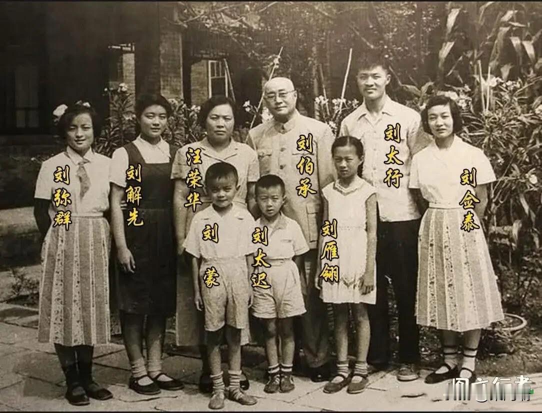 这张照片是刘伯承元帅和他的家人在1950年代的合影。 刘伯承(中后)是中国人民解放军的创建者之一,被授予中华人民共和国元帅军衔。他身边的家人包括他的妻子汪荣华(中左)和他们的七个孩子。 从左到右,孩子们分别是:刘弥群、刘解先、刘华北(早逝,未在图中)、刘蒙(前左)、刘太迟(前右)、刘雁翎和刘金泰。这张照片记录了这位开国元勋家庭的温馨瞬间。