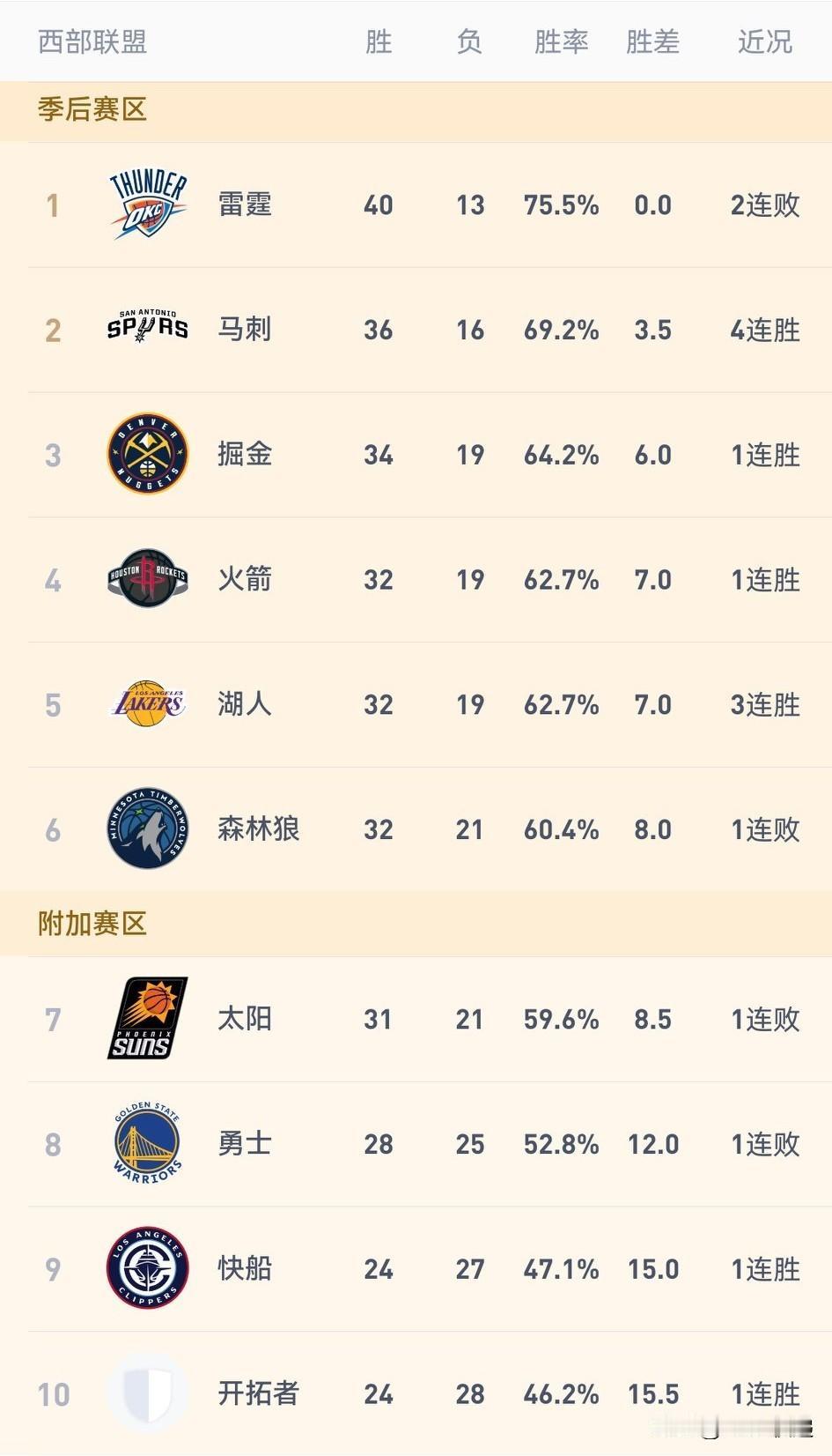 2月8日NBA西部前八排名没变化,森林狼今日没有比赛,因太阳输给76人,前者继续排名西部第六(落后火箭和湖人1个胜场),后者31胜22负落后森林狼1个胜场继续排名西部第七。输给76人的比赛中,狄龙得到28分2板2助,布克21分9助,杰伦格林8分3板3助。 掘金依靠最后一节的39-16拿下公牛继续排名西部第三。穆雷28分11助,约基奇22分14板17助4帽。 火箭最后一节硬了一把,战胜了没有杰伦威和亚历山大的雷霆继续进行排名西部第四。伊森26分8板3断,申京17分12板11助3断3帽,史密斯20分10板,杜兰特20分4助,谢泼德16分6助3断。 湖人虽然缺少了东契奇,但詹姆斯拿下20+7+10,全队6人得分上双拿下了没有库里的勇士,目前战绩32胜19负与火箭持平继续排名西部第五。八村垒18分,斯玛特15分3板4助,里夫斯16分5板8助2断。 勇士虽然输给湖人,但他们仍领先第九名快船3个胜场稳坐西部第八。 雷霆两连败,战绩40胜13负领先西部第二3.5个胜场(领先东部第一活塞1个胜场)继续排名联盟第一。 马刺战胜独行侠取得四连胜,战绩36胜16负领先掘金2.5个胜场继续排名西部第二。卡斯尔40分12板12助3断,文班亚马16分11板3帽。