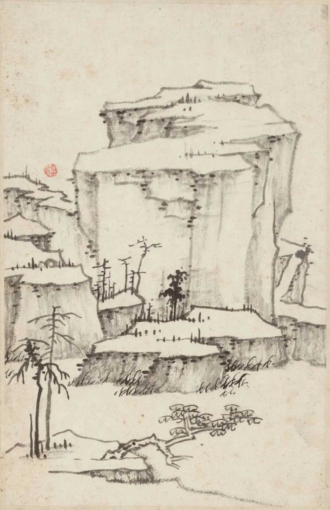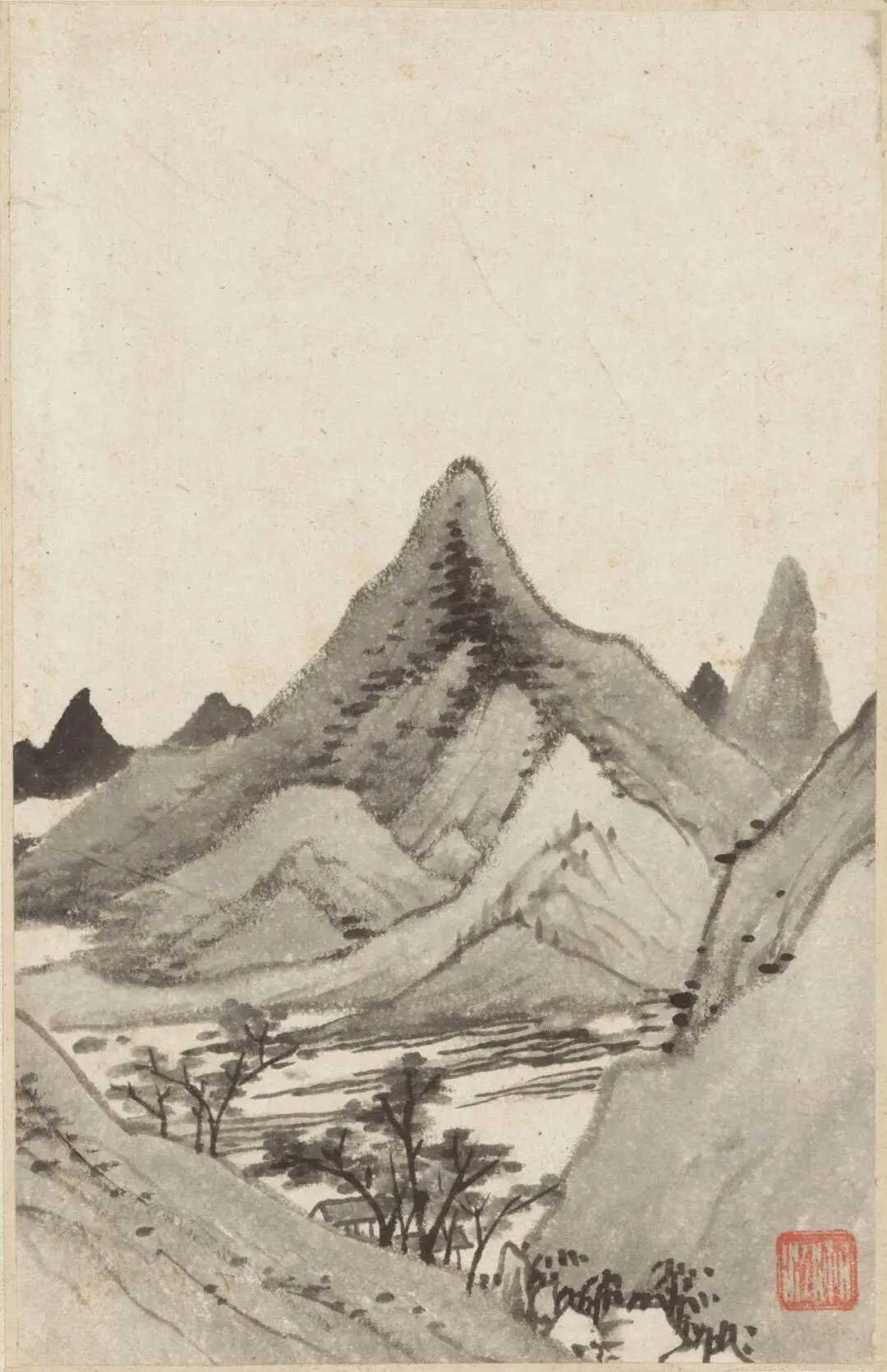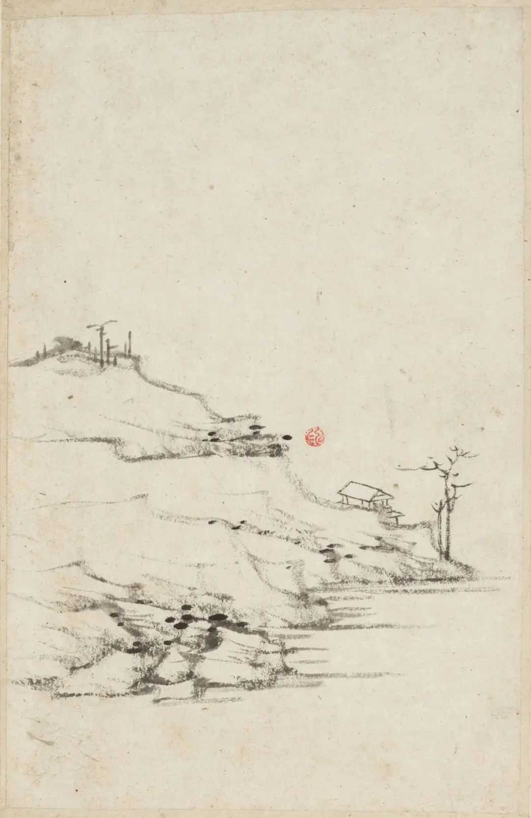 清 弘仁《山水册》纸本 册页 水墨 22x14.5 厘米,安徽博物院藏。这组册页作于顺治十五年(戊戌,1658年)十二月,弘仁时年49岁。当时为大雪阻于沚阜,暂居苏姓居士家,心怀感激,作画十幅,赠与主人为谢。这就是中国风遇见艺术
