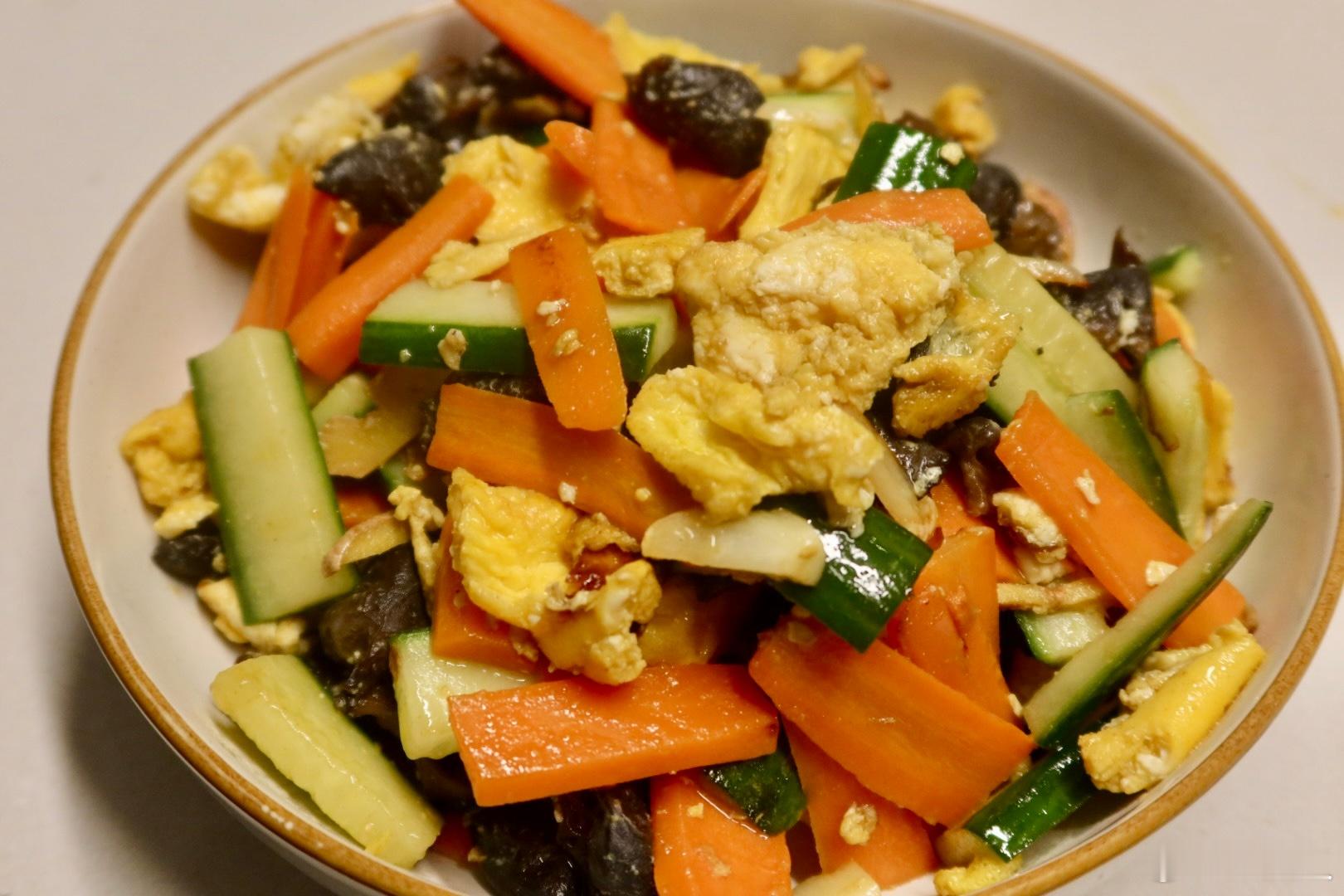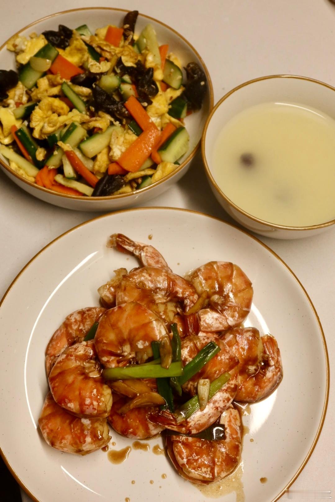 早午餐:虾仁荷包蛋香葱青酱荞麦面晚餐:黄瓜胡萝卜木耳炒蛋、葱姜大虾、小米粥