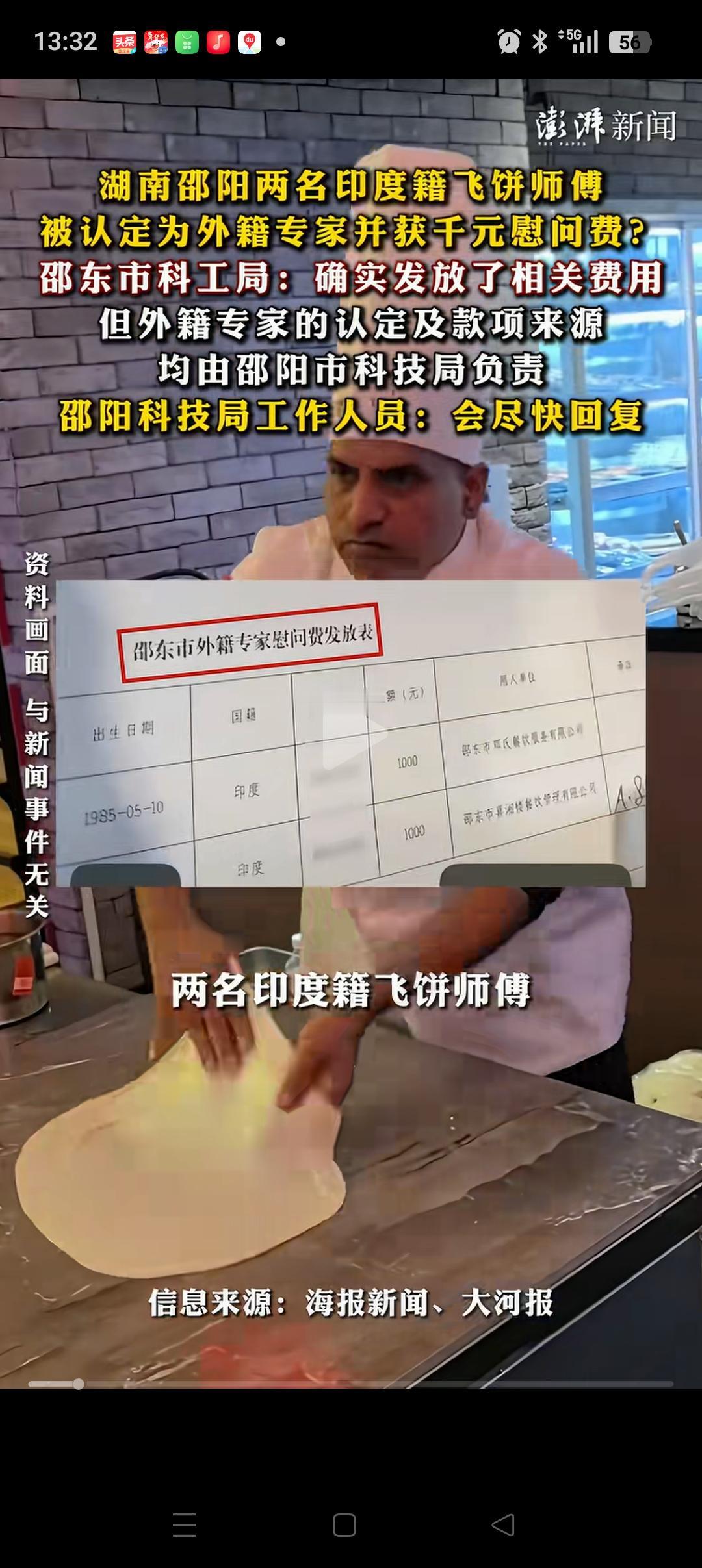 邵阳科技局的领导人都麻了!没想到:仅仅因为给印度两个飞饼师傅发了1000块钱的慰问金,却意外上了热搜! 现在大多数网友的观点是:如果印度飞饼也算科技的话,那么各地的那些传统美食,比如:油条,烧饼,锅盔,米花糖等等,那些大叔大婶们也可以得到这个奖励。 网友的质疑也能理解,毕竟这个慰问费用确实发的有点让人看不懂。 到底是怎么认定的,需要邵阳科技局尽快解释。 如果是领导自掏腰包当然没问题,但如果是发的补贴,那需要有一些依据。。