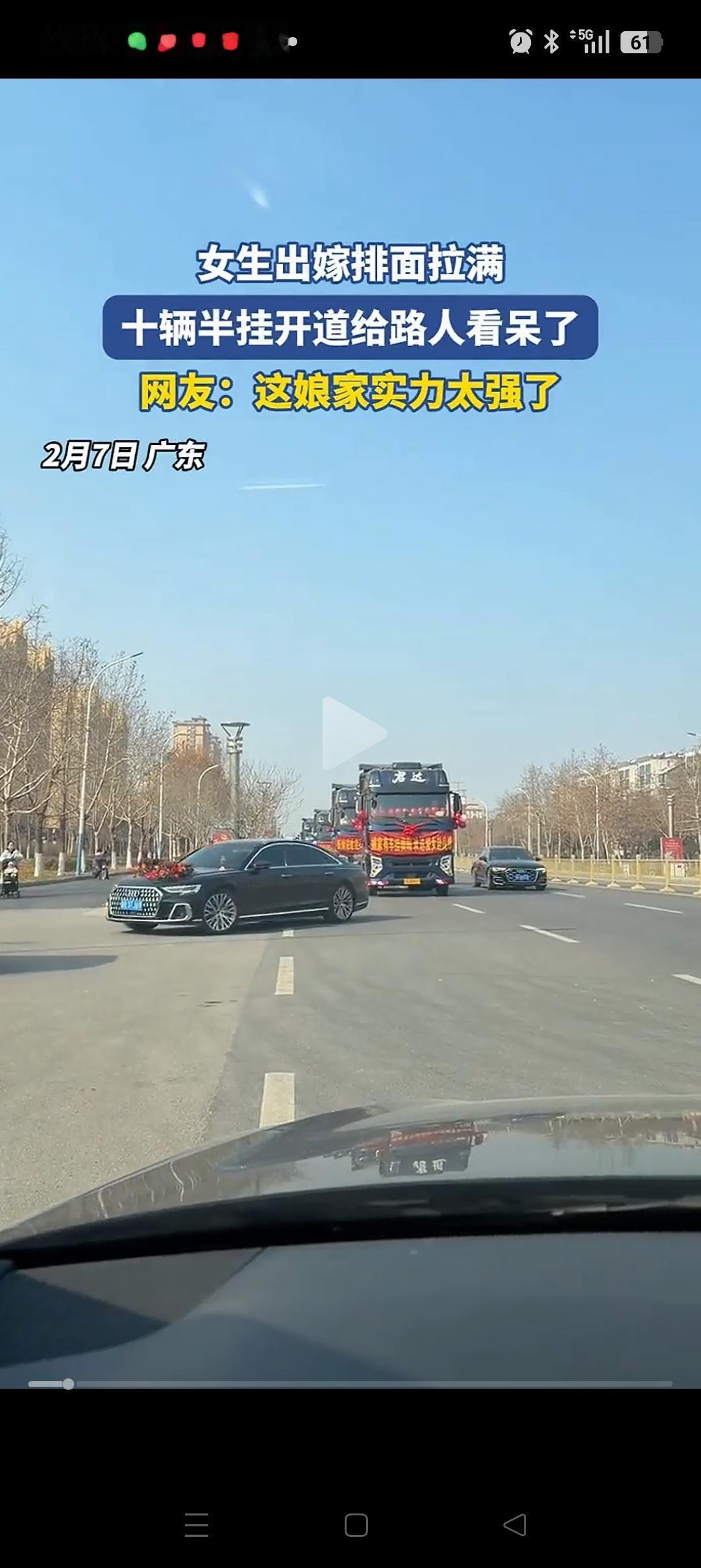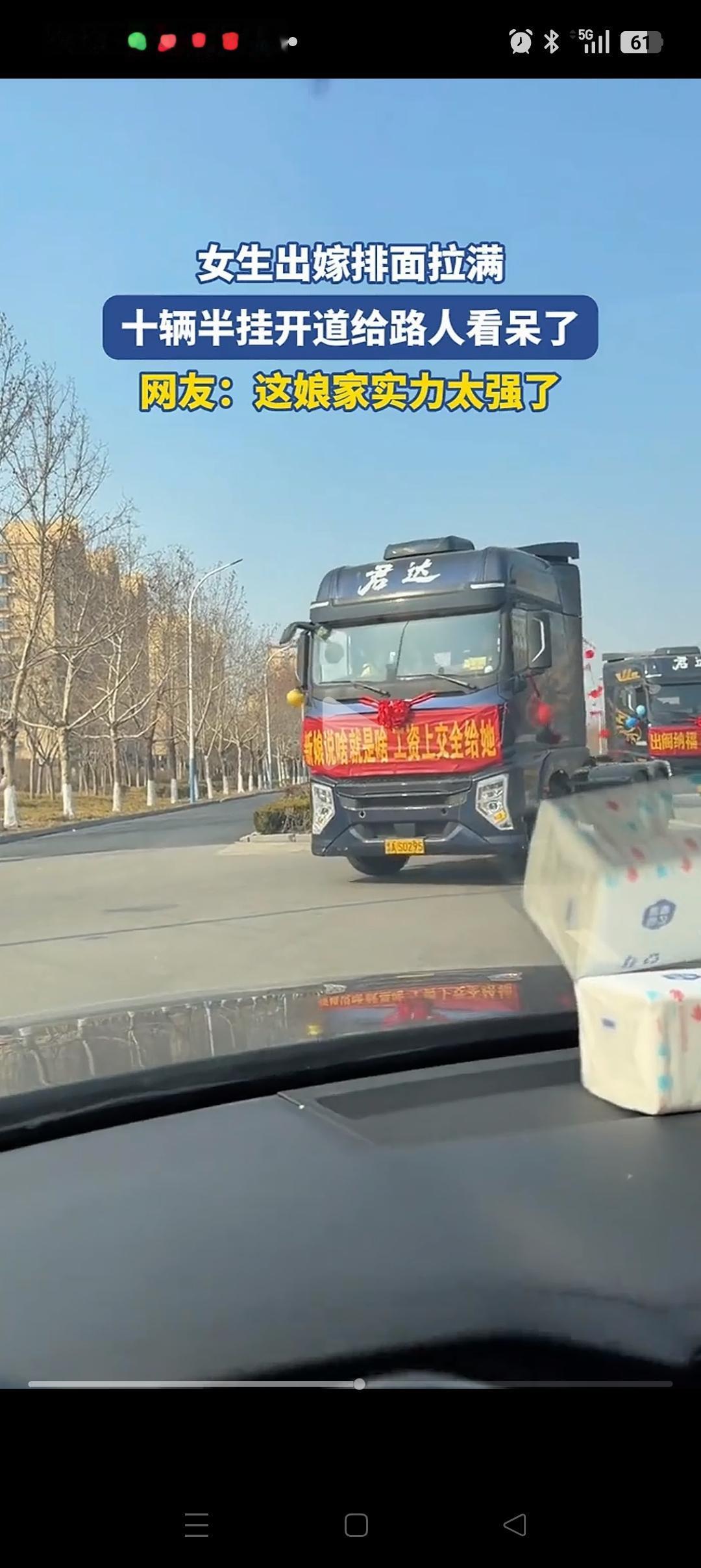 “太有排面了”,单县一新娘出嫁,不知道从哪里弄来了10辆半挂大货车送祝福。也没有拉东西,纯粹就是凑热闹,只拉了一些祝福的横幅。当然此举也引发了网友的一些热议: 有的网友觉得这么做毫无意义:因为婚车就是拉东西的,但是为了讲究排面,弄一些半挂车,空空的,有一点堵塞交通了,没必要。 但我觉得人家这么做也无可厚非,毕竟结婚是个好事。想热闹点也没错,只要人家开心就好。 看到有网友留言:这是她们公司的财务结婚,公司的员工就一起去凑热闹的,图个喜庆。 看到这里,还有一点小感动,毕竟能让这么员工去捧场的,肯定是个好人[玫瑰][玫瑰]