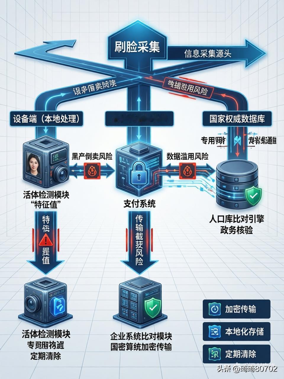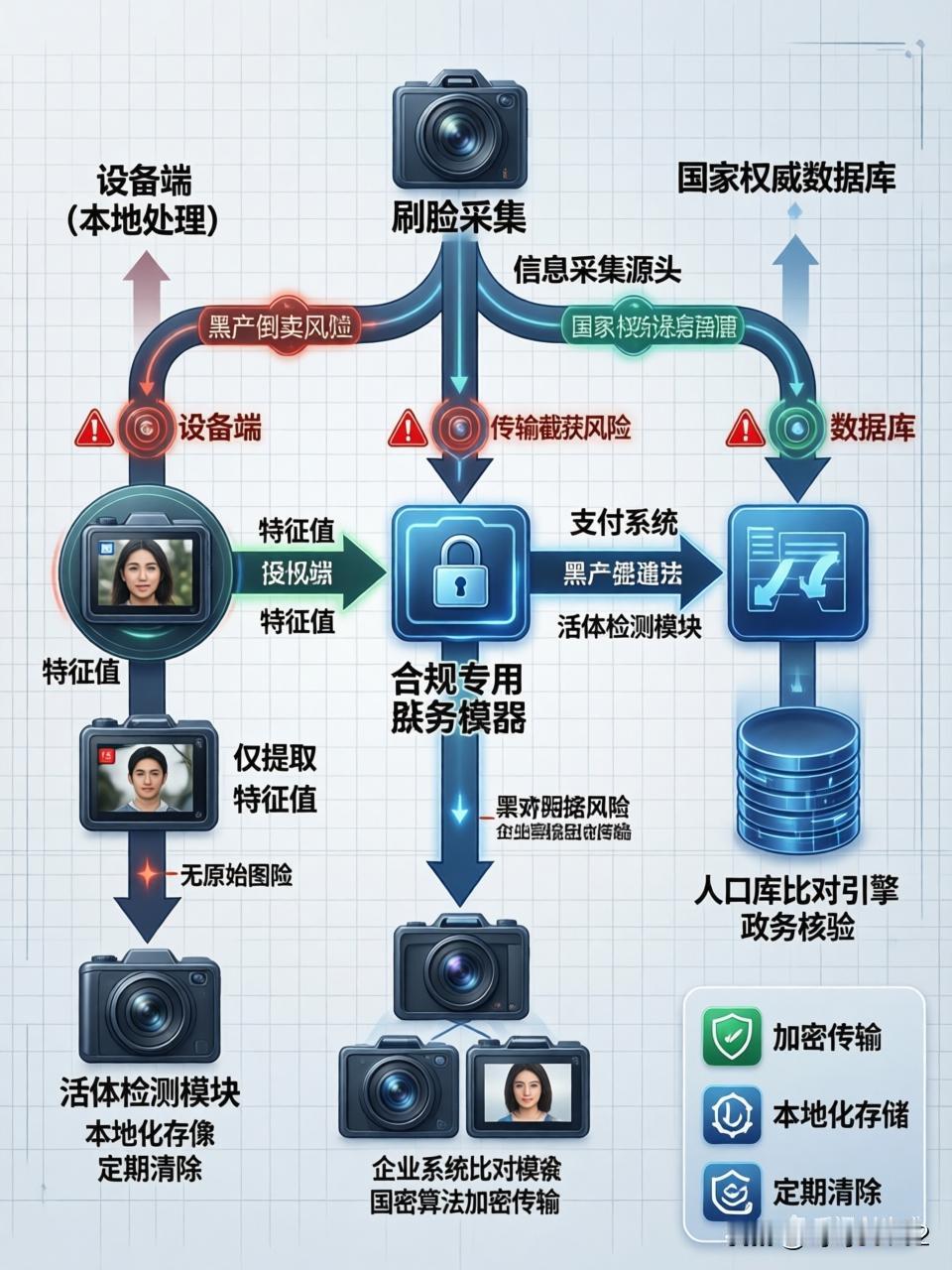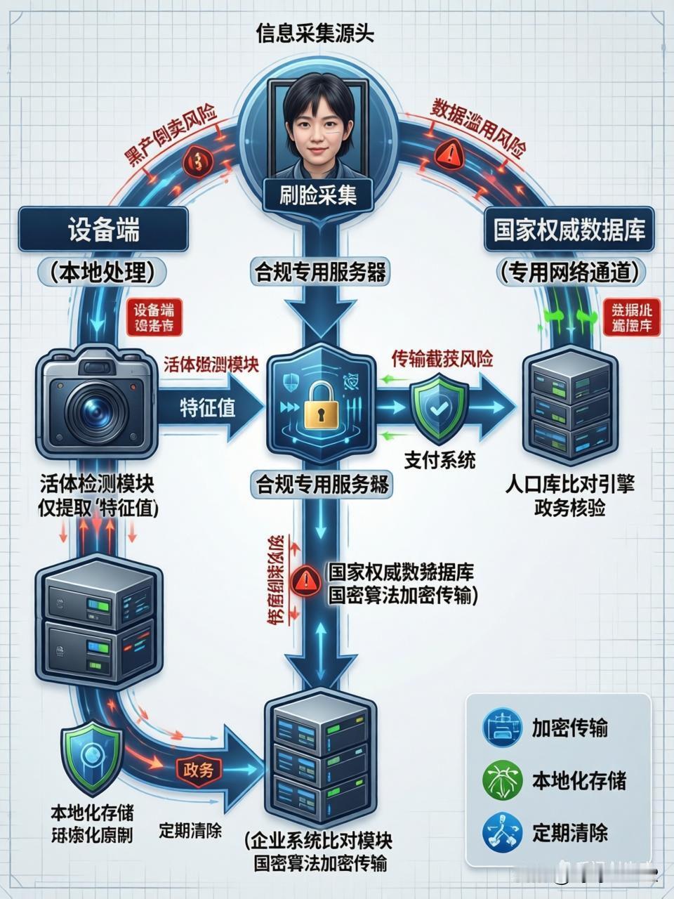 刷脸采集的信息最终流向何处? “刷脸”后信息去向的担忧,是数字时代核心隐私问题。简单讲,人脸信息采集后经加密处理,主要流向三个受严格监管之处:一是设备端,用于即时活体检测;二是合规专用服务器,进行安全比对;三是国家权威数据库,用于关键身份核验。整个过程遵循“最小化、本地化”原则,最大程度保护隐私安全。下面详细拆解流程,聊聊风险防范。 一、数据流向核心路径 1. 终端设备层 刷脸终端(如支付机、门禁系统)仅执行本地活体检测与人脸采集,原始图像数据加密传输,设备无存储功能。为防信息泄露,终端对预览图像分辨率压缩或添加水印,与实际识别图像形成差异。 2. 传输加密层 人脸数据经加密通道(如SSL/TLS协议)传输至收单机构或服务平台服务器,防网络截获。2025年新规要求:除法律另有规定,人脸信息不得通过互联网对外传输,需存于本地设备。 3. 后台处理层 - 支付场景(如支付宝、微信):上传人脸图像与用户开户时留存人脸底库比对,完成1:N识别,数据作为支付凭证保存,后续按监管要求定期清除。 - 政务场景(如医保刷脸):通过医保专用网络传至区域平台,与国家人口库或医保电子凭证信息自动关联,实现身份核验与结算。 - 企业自建系统:部分企业将数据存入内部数据库用于员工认证或会员管理,需向网信部门备案。 二、数据存储与安全规范 存储主体 数据用途 安全措施 支付平台/银行 支付凭证、身份核验 加密存储,定期清除;通过网络安全等级保护认证 医保系统 医保结算、身份认证 专用网络传输,数据与参保人唯一绑定 政务服务平台 社保、户籍等业务办理 对接国家人口库,减少本地存储 企业自建系统 门禁、考勤等内部管理 需备案并制定专项保护规则 关键限制: - 人脸信息保存期限不超实现目的所需最短时间。 - 存储量达10万人以上的系统,需向省级网信部门备案。 三、隐私风险与防护机制 1. 泄露风险点 - 黑产倒卖:不法分子入侵数据库或内部倒卖获取人脸数据,结合身份信息伪造动态视频(如“照片活化”技术),绕过支付验证。 - 传输截获:未加密传输的数据可能被截取,尤其在公共网络环境。 2. 合规防护措施 - 法律约束:2025年《人脸识别技术应用安全管理办法》要求: - 取得用户单独同意,处理未成年人数据需监护人授权。 - 禁止将人脸识别作为唯一验证方式,提供替代方案(如密码、指纹)。 - 技术升级:采用3D结构光、微表情分析等活体检测技术,防范照片/视频攻击。 四、用户应对建议 1. 主动防护 - 在非必要场景(如普通APP注册)拒绝刷脸授权。 - 定期检查支付平台授权列表,关闭闲置权限。 2. 维权途径 - 发现信息滥用向网信部门举报(留存证据)。 - 对疑似盗刷行为立即冻结账户并报警。 总结 刷脸数据流向由场景需求与合规框架决定:支付场景侧重加密传输与短期留存,政务场景依托国家数据库减少本地存储,企业应用需备案并受监管。虽有黑产盗取风险,但2025年新规通过“最小必要”原则、本地化存储和严格备案制度提升数据安全性。用户需保持警惕,善用知情权与拒绝权,平衡便利与隐私保护。