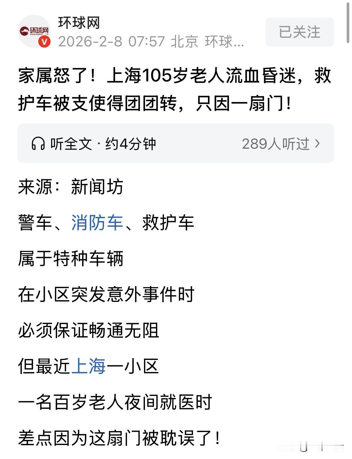 上海,105岁老人起夜时摔倒,头磕桌角陷入昏迷,家人连忙叫120,谁料,救护车开到小区东门时,保安说这门只进不出,必须换一个门,任凭家属怎么求情,保安就是不肯通融,救护车只能绕路,浪费了5分钟。家属事后感叹,幸好老人命大,要是因为绕路耽搁了,家里恐怕已经在办丧事了! 1月31号凌晨2点,105岁孟老太起夜上厕所。 屋里黑灯瞎火的,孟老太没看清路,脚下一滑,整个人重重地磕在了桌角上。 孟老太毕竟是百岁高龄,身体脆得像纸一样。这一撞,她额头上瞬间就豁开了一个大口子,血不停往外冒,人也陷入昏迷。 家里人听到动静看到这一幕,魂都吓飞了,赶紧手忙脚乱地打120。 救护车来得倒是快,谁料,后面发生的事让家属们气愤不已。 当时孟老太已经昏迷不醒,120急救人员从五楼把老人抬下来,那是争分夺秒。 为了抢时间,司机一脚油门直奔离得最近的小区东门。按理说,毕竟拉的是危重症病人,这门怎么也得赶紧开吧? 结果,东门的保安跟个木头桩子似的,站在那儿一动不动。 不管家属怎么求,怎么喊“老人快不行了”,保安就是一句话:这门只进不出,规定就是规定,你们得绕去别的门。 求助人孟先生当时就在现场,看着满脸是血的奶奶,急得都要给保安跪下了。 他后来跟记者说,平时这个门确实只进不出,但那是凌晨2点啊!又是救命的车,你就把杆子抬一下能咋地? 可那保安就是不肯通融,非逼着救护车倒车、绕路。这一折腾,整整5分钟没了。 大家都知道,对于一个百岁老人,尤其是头部重创、血流如注的情况,5分钟意味着什么?那就是生与死的距离。 孟先生认为,制度是死的,人是活的呀。那时候真是绝望,看着血一滴一滴流,车却在倒来倒去。 事后,记者去采访,物业经理表示:原则上进口确实不出车,但救护车、消防车这种特种车,肯定是要放行的,按个遥控器的事儿。 既然道理都懂,为啥当晚没做到?当班保安给出的理由是,系统坏了。 保安说,当时他想用遥控器开闸,遥控器没反应,想用电脑操作,电脑也不听使唤。 两套系统,偏偏在救命的时候同时“罢工”了。 但记者在现场转了一圈,也没看出这门禁系统有啥毛病。 物业经理赶紧出来打圆场,说是因为当晚又冷又有毛毛雨,可能是受潮了,遥控器接触不良。还信誓旦旦地说已经找人来修,还要加强培训。 可家属却对此存疑。早不坏晚不坏,救命车来了就坏?还两套系统一起坏?这概率比中彩票还低吧。 说白了,恐怕还是保安脑子里的那根弦没搭对,觉得多一事不如少一事,怕坏了规矩被领导骂,却忘了规矩是为人服务的。 好在孟老太虽然105岁了,但身子骨还算硬朗,经过医院抢救,命是保住了,也没伤着脑子。 但额头上那道7厘米长的豁口,缝了不少针,看着就让人心疼。 孟先生说,奶奶现在回家休养了,但这事儿在他心里过不去。如果不是老人命大,要是在绕路那几分钟出意外,现在家里恐怕已经在办丧事了。 回看这件事,暴露的是基层管理里的冷漠病。 物业为了管理方便,搞个只进不出本来没问题,但在设计规则的时候,就没想过万一有急事怎么办? 保安为了不担责,宁可看着鲜血直流也不愿抬一下手,这不仅是死板,更是麻木。 现在的城市,高楼越来越多,门禁越来越严,但人情味有时候却越来越淡。我们理解保安怕违规被罚,但当生命安全和管理规定撞车的时候,毫无疑问,生命必须排在第一位。 根据《民法典》第288条规定:不动产的相邻权利人应当按照有利生产、方便生活、团结互助、公平合理的原则,正确处理相邻关系。 虽然保安行为没有直接造成严重后果,但物业只进不出的门禁管理与业主生命急救需求产生了冲突。 物业作为小区管理者,设置的门禁系统属于对建筑物共有部分的管理。 根据法条精神,不动产权利人对相邻权利人的合理通行需求负有容忍和提供便利的义务。 当孟阿婆生命垂危、救护车需走最短路径时,这种便利不再是普通的通行权,而是关乎生命权的紧急通道。 保安机械执行只进不出规定,且在设备故障时未及时采取人工抬杆等应急措施,违背了公平合理原则。 法律设立相邻关系条款的初衷,正是为了防止权利人滥用所有权或管理权损害他人权益。在生命危急关头,物理上的“门禁”必须让位于法律上的人权。 总之,制度是为人服务的,在涉及人身安全的紧急情况下,打破常规提供便利不仅是道德要求,更是法定义务。 对于这件事,你怎么看? 欢迎关注@一案一论