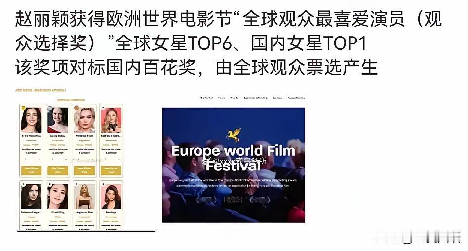 赵丽颖,冲上热搜! 2月7日深夜,赵丽颖突然冲上热搜,不是因为新角色,而是她传来了一个大好消息,这次她再获国际认可,成功拿下欧洲世界电影节“全球观众最喜爱演员(观众选择奖)”,位列全球女星TOP6、国内女星TOP1,实力与海外人气双丰收。 她的作品在世界都挺火啊,当年她的楚乔传还被戛纳邀请做特别展映,知否也在日本这些国家很火,与凤行也被美国等200多个国家买了版权,杉杉来了也被韩国翻拍,谁是凶手好像也在韩国还是哪个国家放映过。实力演员剧在国内火,在国外也火。所以国外她的剧粉也很多。 补充一下,亚洲女星入围的只有她一个人。而且必须绑定海外银行卡实名认证一人一票,还要花一欧元才能投票的。 天哪外国粉丝投了五万欧!!! 而且这个卡IP卡国外银行卡才能投! 看汇率一欧元等于8块多人民币了!! 赵丽颖国际影响力有全球女明星第6国内第一! 有付出就有回报👍赵丽颖在自己的电影世界里…就是一只野凤凰,自由飞翔…为了证明自己的实力,撸起袖子…演出自己的风格和别人不一样的感觉,为她喝彩加油✊✊✊ 与凤行时,海外版就赚翻了,要不腾给她颁发年度贡献奖,以前可没听说过。😳 恭喜丽颖获奖成功,能够得到国际认可,是她自己所付出的努力得到的回报,再接再厉,会获得更多惊喜出现。👍👍👍赵姐入选,不突然,不震惊,不无奈,不需要给谁交待,她就是值得,就是配。👍👍 赵丽颖能拿到这国际奖项实至名归。近来频频出现在影视剧中演绎出了不同类型的角色,每个角色都演绎得很到位,能将剧中人物与角色融合,最难得的角色是电影《第二十一条》中的哑女这演技与电视剧《小城大事》中的基层干部两个角色不同的类型,人物的反转对比,演绎出了真实感,确实功底扎实,厉害。🫰🫰🫰 网友表示:好姑娘,我特喜欢看你演的每一部电视剧和电影。也持喜欢你本人。你的美丽你的大量及你的人品都是最最好的,我是77岁的老妈妈,孩子愿你幸福,愿你快乐永远美丽大方。赵丽颖!