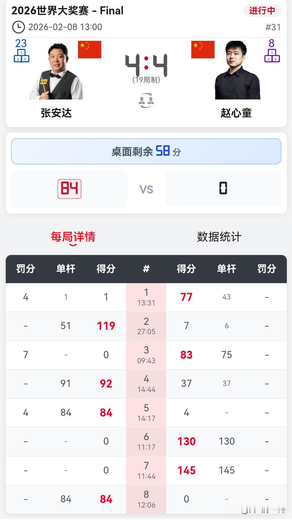 香港大奖赛决赛,激战正酣。赵心童和张安达都发挥了自己高水平,比分现在是4-4平手。 赛前预测,赵心童70%的胜率,张安达30%。但是比赛并没有想象中这么简单。 第一局,张安达运气不佳,打红球白球摔袋,赵心童幸运拿下。 第二局,赵心童打长台靠近边库红球,难度很大,没进。给张安达留下机会,张安达一杆带走。 第三局,赵心童长台上手,单杆75拿下。 第四局,赵心童K球运气不好,冒险击打中袋没进。张安达一杆带走。 中场休息回来。 第五局,赵心童做了一杆很好的斯诺克,张安达解球貌似失误。赵心童冒险击打红球,结果漏球。张安达一杆拿下。 第六局,张安达开局送礼,赵心童单杆130分拿下。 第七局,赵心童长台打进,单杆145分,拿到本次大奖赛单杆最高分,收获1万英镑奖励,超越了之前肖国栋的144分。 第八局,赵心童长台进攻失误,张安达一杆致胜。 比分来到4-4平手。 赵心童依靠自己冒险的进攻给自己创造了机会,但是一旦进攻失误就被张安达抓住。比分很胶着。 晚上7点,将是第二阶段的比赛,还有的看。
