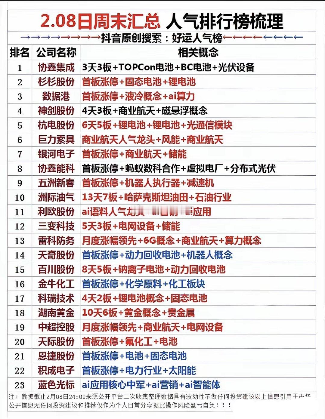 2月8日的人气排行榜梳理!今日人气榜清晰反映了当前A股市场的热点主线,商业航天、多元技术路线的电池(TOPCon、固态、钠离子等)、AI算力及应用、机器人等板块成为资金聚焦的核心领域。多只个股出现连板或首板涨停走势,体现出市场情绪活跃、题材轮动加速的特征,也映射出产业政策与技术突破对资金流向的引导作用。个股梳理分析1. 协鑫集成:3天3板,聚焦TOPCon电池、BC电池等高效光伏技术,是光伏设备领域的核心标的。近期股价连板,彰显资金对高效电池技术路线的追捧,业务布局贴合光伏产业升级趋势。2. 杉杉股份:首板涨停,核心布局固态电池、锂电池产业链,在负极材料等环节具备深厚技术积累。固态电池技术突破的预期,带动市场关注度快速提升,业务协同性较强。3. 数据港:首板涨停,主打液冷概念与AI算力,为数据中心提供高效冷却解决方案,精准适配AI算力基础设施的升级需求,直接受益于东数西算工程与AI产业爆发。4. 神剑股份:4天3板,涉及商业航天与磁悬浮概念,在航天复合材料领域具备技术储备。商业航天产业的政策催化下,相关业务迎来实质性发展机遇。5. 杭电股份:6天5板,覆盖锂电池、光通信模块业务,光通信模块适配算力网络传输需求,锂电池业务布局完善,双轮驱动下股价表现强势。6. 巨力索具:商业航天人气龙头,同时布局风能领域,为航天发射提供索具等核心配套,风能业务受益于新能源装机增长,双赛道支撑业绩。7. 银河电子:首板涨停,聚焦商业航天与储能,在航天电源、储能系统等环节具备技术优势,商业航天产业扩容与储能政策推进共同驱动业务增长。8. 协鑫能科:首板涨停,与蚂蚁数科合作布局虚拟电厂、分布式光伏,虚拟电厂适配新型电力系统需求,分布式光伏贴合双碳目标,合作强化了资源整合能力。9. 五洲新春:首板涨停,主打机器人执行器、减速器,是机器人核心零部件供应商,受益于工业机器人与人形机器人产业爆发,技术壁垒较高。10. 洲际油气:13天7板,核心资产为哈萨克斯坦油田,石油行业周期复苏带动油价上行,公司油气资源储备充足,业绩弹性较大。11. 利欧股份:AI语料人气龙头,布局AI营销与AI应用,在AI数据标注、营销算法等领域具备优势,AI产业爆发带动相关业务订单增长。12. 三变科技:5天3板,聚焦电网设备与储能,为电网提供输变电设备,储能业务适配新型电力系统需求,双业务线受益于能源结构转型。13. 雷科防务:月度涨幅领先,涉及6G概念、商业航天、算力概念,在卫星导航、雷达等领域技术积累深厚,多赛道布局契合科技产业趋势。14. 天奇股份:首板涨停,主打动力回收电池与机器人概念,动力回收电池业务受益于锂电池回收政策,机器人业务布局智能装备领域,双轮驱动增长。15. 百川股份:8天5板,覆盖钠离子电池、动力回收电池,钠离子电池技术突破加速产业化进程,动力回收业务贴合双碳目标,成长空间广阔。16. 金牛化工:首板涨停,主营化学原料,属于化工板块,化工行业周期复苏带动产品价格上行,公司产能布局完善,业绩具备支撑。17. 科瑞技术:4天2板,涉及锂电池概念、固态电池,为锂电池生产提供设备与解决方案,固态电池技术储备丰富,受益于电池技术迭代。18. 湖南黄金:10天6板,聚焦黄金、贵金属,黄金价格上行周期下,公司矿产资源储备充足,业绩弹性显著,避险属性凸显。19. 中超控股:月度涨幅领先,涉及商业航天、电网设备,在电缆等电网设备领域具备技术优势,商业航天业务布局配套环节,双赛道受益。20. 天际股份:首板涨停,主打氟化工、电池,氟化工产品为电池上游材料,受益于电池产业扩容,业务协同性较强,业绩具备支撑。21. 恩捷股份:首板涨停,聚焦电池、固态电池,是锂电池隔膜龙头企业,固态电池隔膜技术储备深厚,受益于电池技术升级与国产替代。22. 积成电子:首板涨停,涉及电力行业、太阳能,为电网提供自动化设备,太阳能业务布局分布式发电,双业务线贴合能源转型趋势。23. 蓝色光标:AI应用核心中军,布局AI营销、AI智能体,在AI内容生成、营销算法等领域具备优势,AI产业爆发带动业务增长。总结今日人气榜覆盖了商业航天、多元电池技术、AI算力、机器人等多个当前市场热点赛道,多只个股的连板走势,反映出市场情绪的活跃。其中,商业航天与电池技术路线成为资金核心聚焦方向,AI相关板块也持续获得关注。后续需持续跟踪题材的持续性与产业政策的催化力度,以把握市场节奏。本文涉及资讯、数据等内容来自网络公共信息,仅供参考,不构成投资建议!
