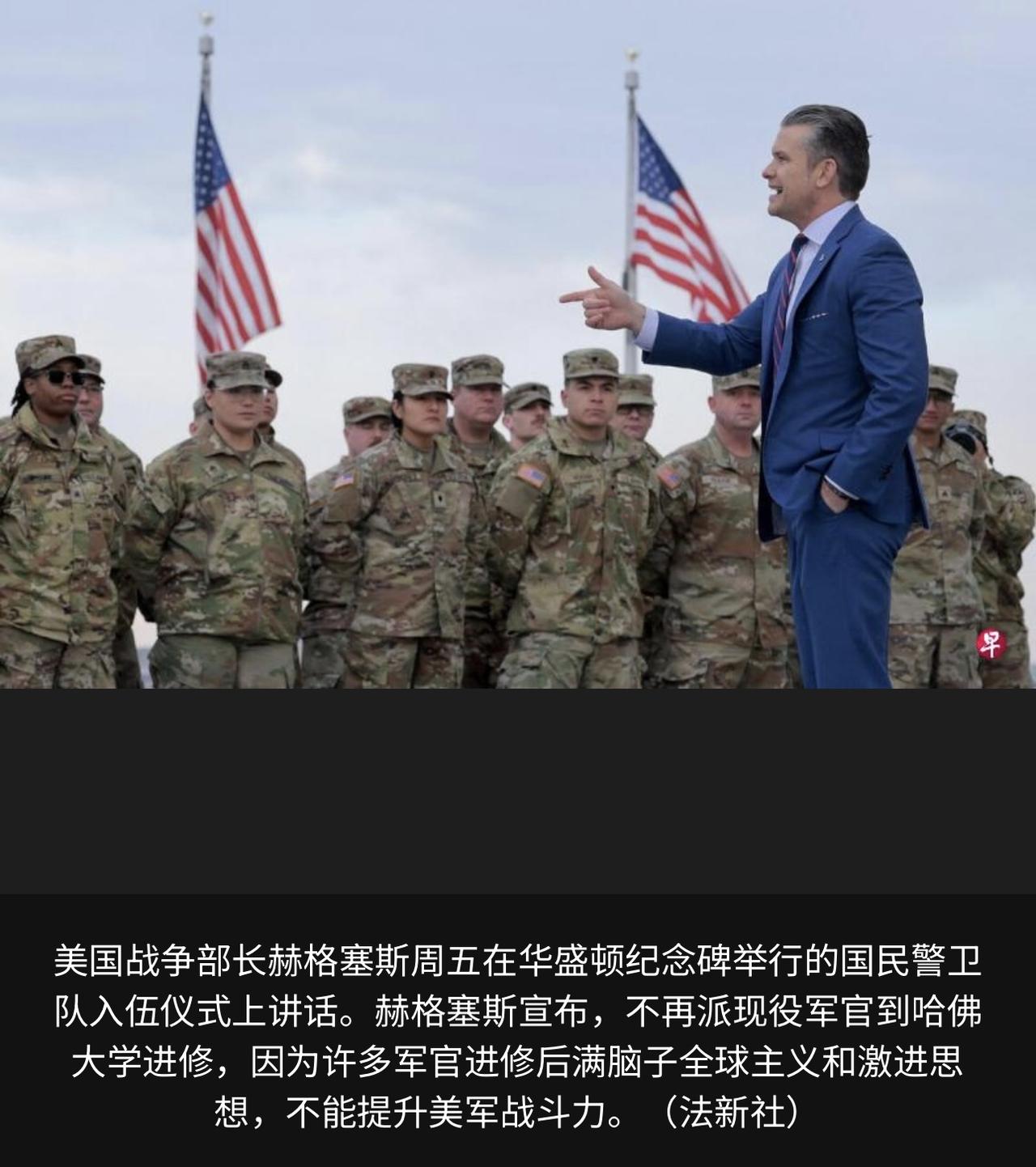 美国终止派遣现役军官赴哈佛大学进修的合作项目 赫格塞斯批评哈佛过于“觉醒”和左倾,导致军官学成后思想过于“全球化”和激进,无益于提升作战能力。 赫格塞斯本人虽拥有哈佛硕士学位,但据称已退还证书。他批评哈佛鼓吹“仇视美国运动”。 五角大楼表示将重新评估其他常春藤院校的合作是否划算。 此事背景是特朗普政府去年以哈佛校方无法遏止校园内的反犹太活动为由,冻结它的26亿美元联邦拨款。哈佛发起诉讼,双方至今未达成和解。特朗普2月2日称,联邦政府正向哈佛索偿10亿美元。