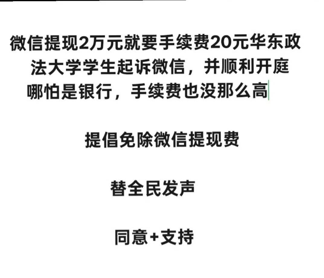 事关每个使用微信提现的人,有什么理由不支持他们呢。 微信提现费早就应该取消了,我一直就觉得不合理,0.1%看起来不多,实则就是流氓行为,我看这个不顺眼很久了,可惜我无能为力,只能无能狂怒。 不平事总有人看不惯会出手,华东政法大学学生联合众多高校法学团队起诉财付通,他们之前好像还打赢了迪士尼“禁止携带食物入园”这个官司,这个行为是为我们所有普通人争取利益,有什么理由不支持他们呢?