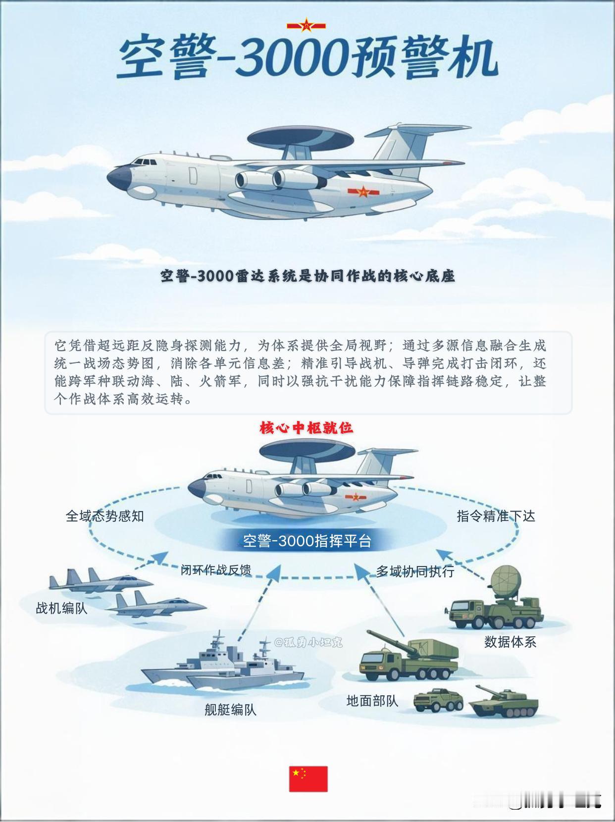 空警-3000上线,战场从此“透明”? 空警-3000的入列,意味着什么? (1) 它不只是“看得远”,更是“看得清、联得通”。反隐身探测与多源融合,把战场拼成一张实时全景图,各军种之间那层“信息迷雾”被真正拨开。 (2) 实战中,它更像一个高速运转的中枢神经:引导打击、抗干扰保通信、跨域协同,让战机、舰艇、地面单元像手脚一样听令配合,闭环就此形成。 它让联合作战,从概念走向了日常。