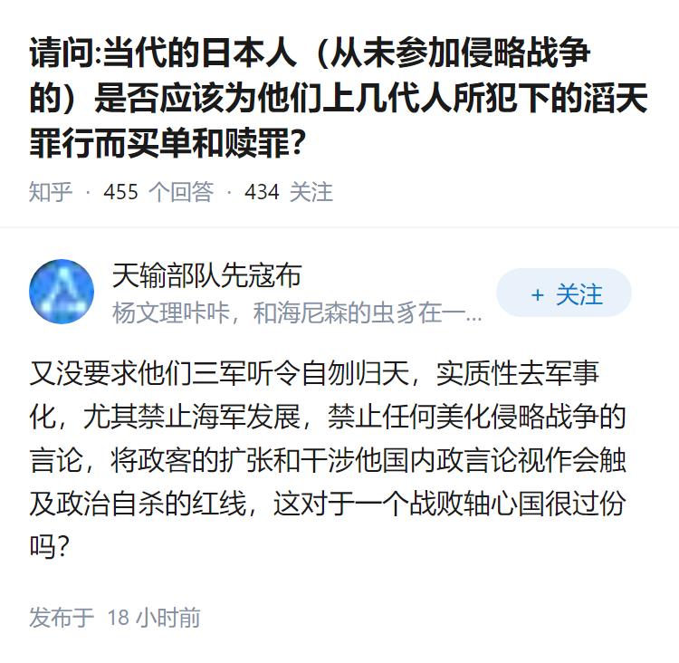 请问:当代的日本人(从未参加侵略战争的)是否应该为他们上几代人所犯下的滔天罪行而买单和赎罪?
