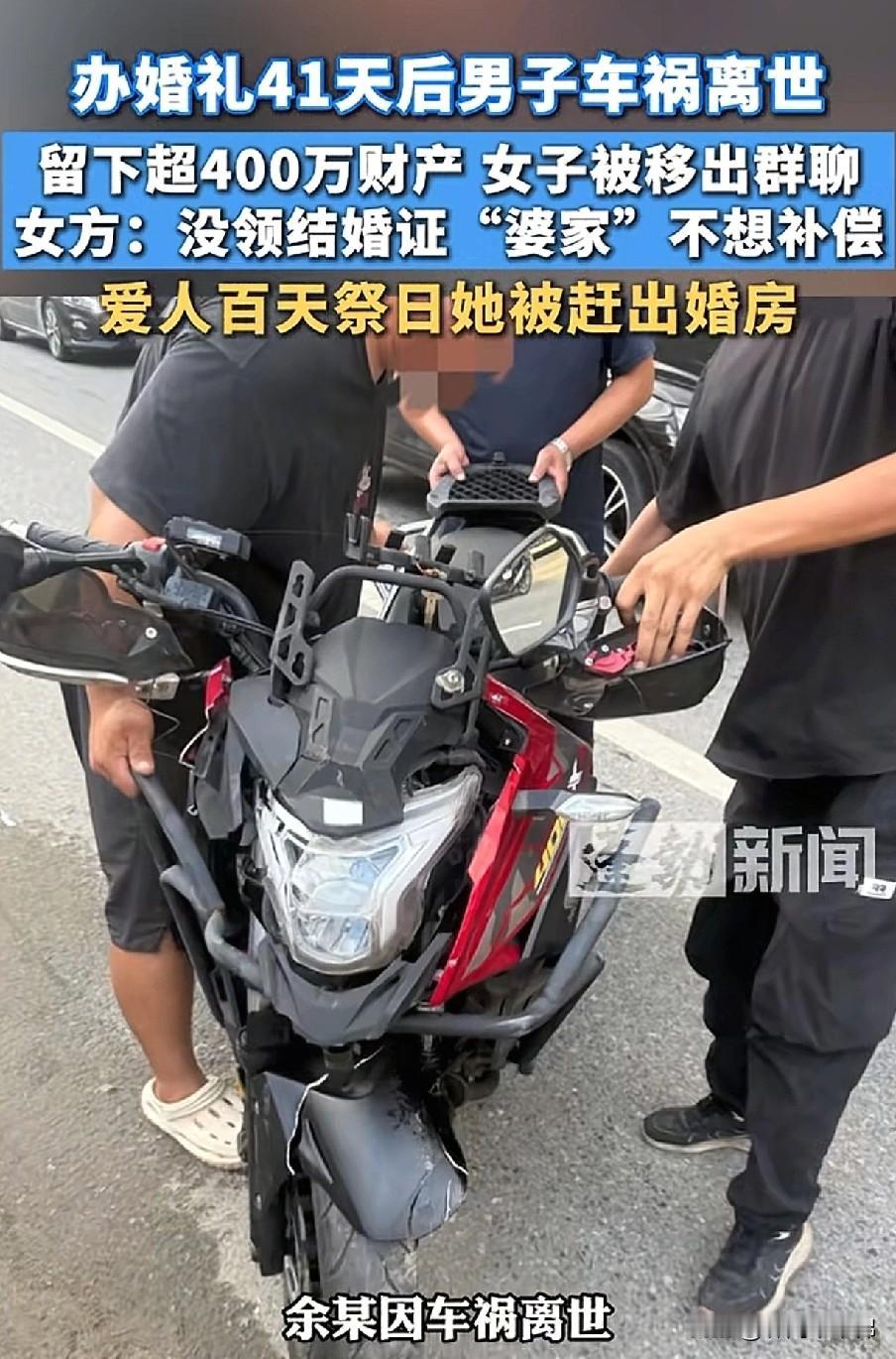 山西朔州这事吵翻天了,女子办婚礼41天还没来得及领证,丈夫就遭遇车祸身亡,留下400万遗产,女子不仅一分钱拿不到,被“婆婆”赶出家门,还被起诉返还49.7万!女子则反诉“婆婆”赔偿200多万! 这事公说公有理,婆说婆有理,这400万遗产到底该怎么分? 我身边做律师的朋友跟我说: 同居,摆酒席,办婚礼都不算法律意义上的结婚! 没领结婚证,法律上就不是夫妻关系!按民年法典规定,男子的遗产应由父母继承,两人没领证,女子没有继承权!这是硬规则! 但是彩礼不用全退,法院会按两人共同生活的实际花销,综合考虑按一定比例退还!虽然婚前两人已经同居过一年多,婚后共同生活了41天,一切都是奔着婚姻去的。但是从1994年开始,法律上已经没有事实婚姻一说,只要没领证,就不是婚姻关系,不受法律保护! 感性来说,女子确实更让人同情,彩礼18.8万,由男子转账,并未说明是做彩礼之用,可以算作男方自愿赠予。且两人同居期间资金混合,有证券等共同投资和共同生活开支,这些钱很难算得清清楚。婆婆一人继承400万遗产,已经不少了,何必对女子赶尽杀绝! 但法理上来讲,感情再好,没有那一纸证书,就啥也不是,遇到事你就是个外人!目前两方分别起诉,案件还在审理,等待法院的最后判决! 有人说,相爱的人一定是先领证,再办婚礼,不相爱的人才会先拿彩礼办酒席,再领证。也有人说,相爱的人不需要一张纸来约束对方,不相爱的人就算有那张纸也约束不了对方。我想说,无论相不相爱,有证就受法律保护,没证就不受法律保护,就这么简单!