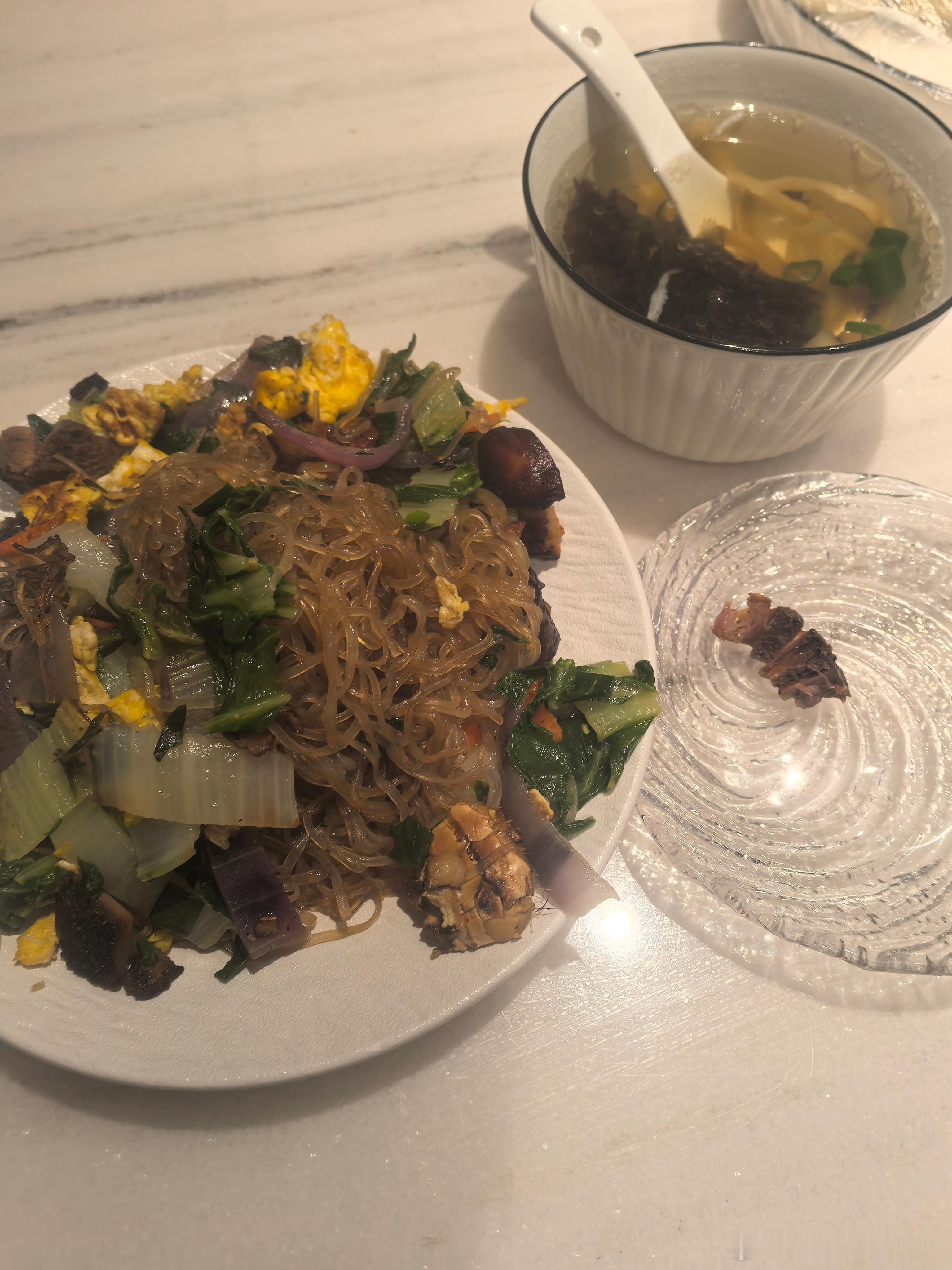 妈妈自己做的粉,自己种的菜自己晒的熏鸡然后老婆炒起来。很好吃可是因为刚才做了个内部上钟,冷了但满满的幸福感