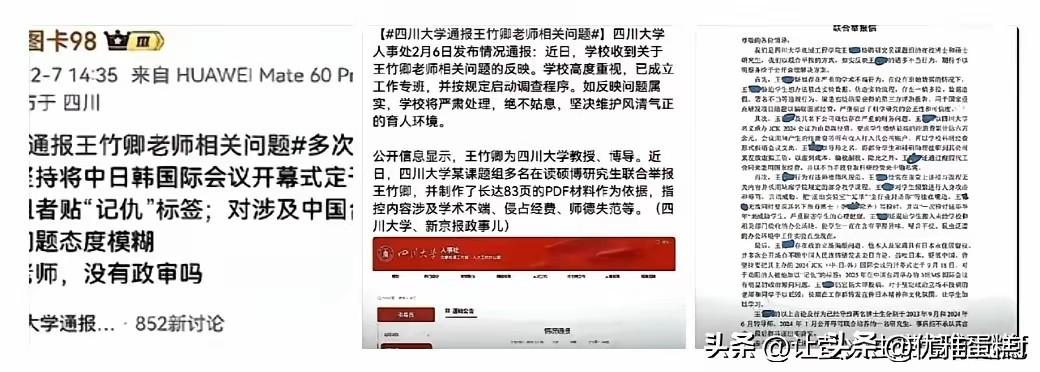 川大博导王竹卿真是丧心病狂!拿着国家千万科研经费,揣着日本永居权,干的全是缺德事!多名硕博生憋不住,爆83页PDF实锤举报。 王竹卿逼学生篡改实验数据,伪造评测报告,用童话写项目申报书骗经费,2016年的成果反复投稿,拿经费当私房钱花。 让学生交高额会议注册费,虚假挂职,偷税漏税……王竹卿骂学生“垃圾”,逼学生在甲醛超标的环境下做实验,威胁延毕。 更可怕的是,王竹卿的家人均为日本永居,师生微信群里亲日言论频现,国际会议定在918开幕,涉台会议态度冷漠。 网友呼吁严查王竹卿及其课题组,清退学术蛀虫!堵塞人才引进和科研经费监管漏洞!此事一经曝光,瞬间在网络上掀起了轩然大波。众多网友义愤填膺,纷纷在各大社交平台表达着自己的愤怒与不满。大家质疑这样的人是如何成为川大博导的,人才引进机制是否存在严重的审查漏洞。 相关部门迅速行动起来,组成了专门的调查组,对王竹卿及其课题组展开全面深入的调查。一时间,整个川大科研圈都笼罩在紧张的氛围中。那些曾被王竹卿压榨的学生们,在看到希望后,也陆续站出来提供更多的证据。 随着调查的推进,更多令人发指的细节浮出水面。原来,王竹卿不仅在学术上弄虚作假,在生活中也极尽贪婪。他利用职务之便,克扣学生的奖学金和补助,将其据为己有。而所谓用童话写项目申报书骗经费一事,背后更是牵扯到一个复杂的利益链条。 与此同时,对于王竹卿亲日言论和不当行为的调查也有了新进展。师生微信群里的亲日言论并非偶然,而是他长期以来错误思想的体现。国际会议定在918开幕和涉台会议态度冷漠,这些行为严重伤害了民族感情,践踏了国家尊严。 面对铁一般的事实,王竹卿再也无法狡辩。最终,他受到了法律的严惩,被取消博导资格,清退出学术界,相关的科研经费也被依法追回。这场风波虽然给学术界带来了伤痛,但也让大家看到了国家整治学术不正之风的决心。相信经过这次事件,人才引进和科研经费监管制度会更加完善,学术界也将迎来更加清朗的明天。
