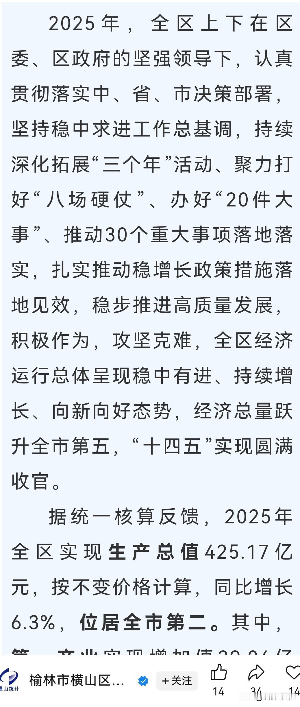 榆林10个县区2025年GDP发布 1.神木市:2454.32亿元 2.榆阳区:2001.12亿元 3.横山区:425.17亿元 4.定边县:418.08亿元 5.靖边县:556.79亿元 6.绥德县:136.69亿元 7.佳县:116.76亿元 府谷县:预计突破1100亿 米脂县:预计达到100亿元 吴堡:预计达到40.24亿元 数据来源于各县统计局或官方报道,子洲和清涧暂未发布地区生产总值。