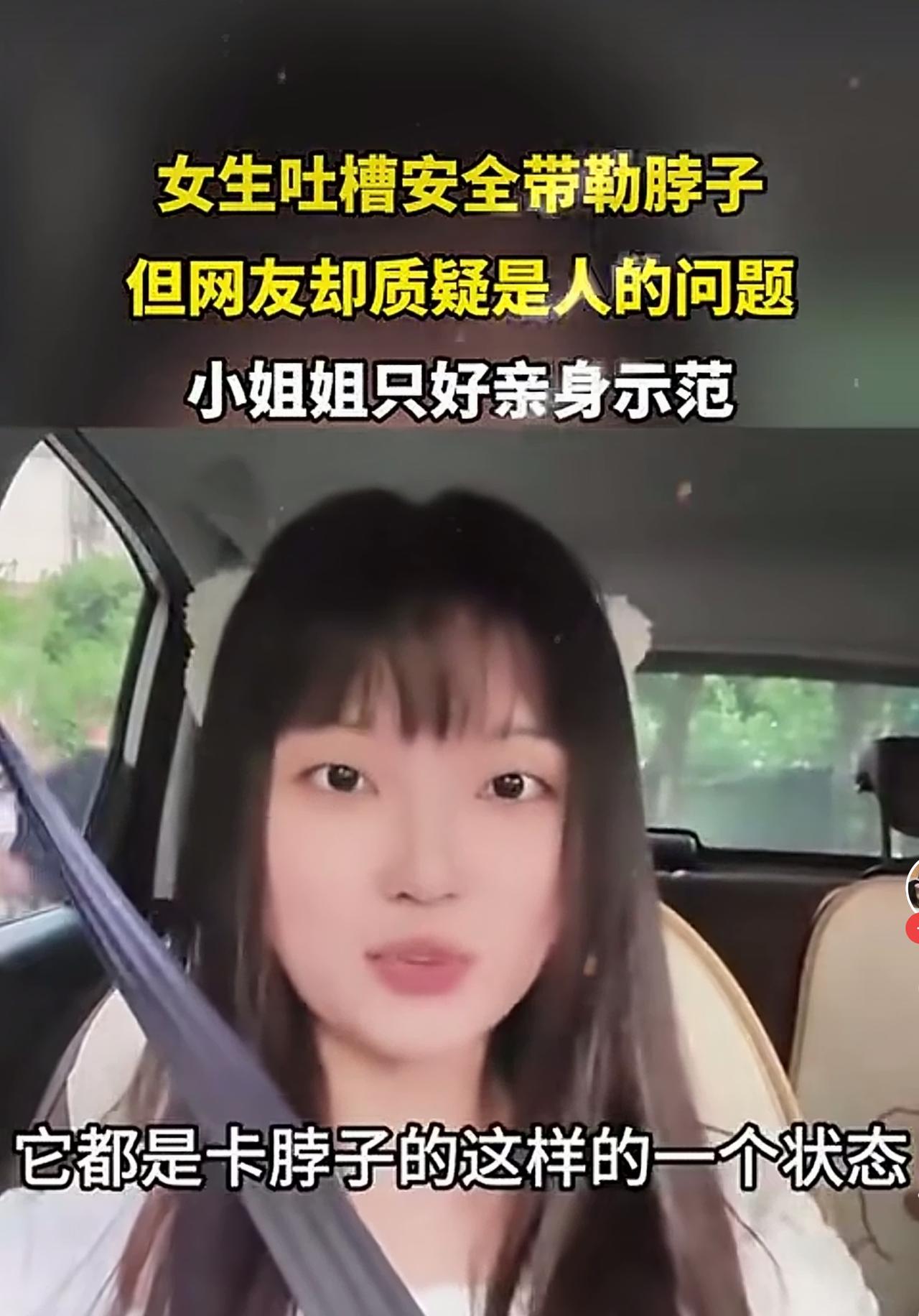 这位小姐姐吐槽安全带太高了,卡脖子,搞不好就是上吊