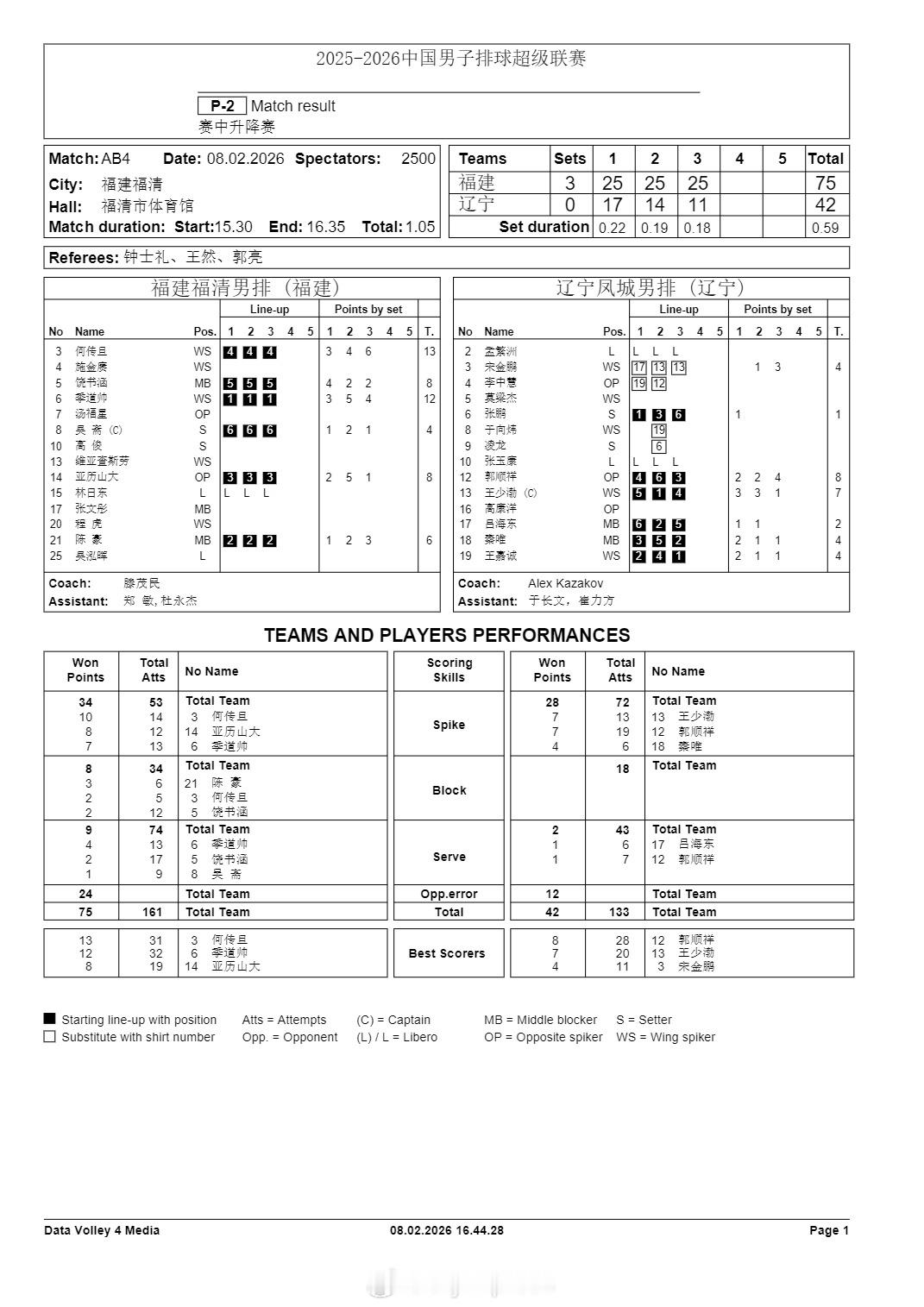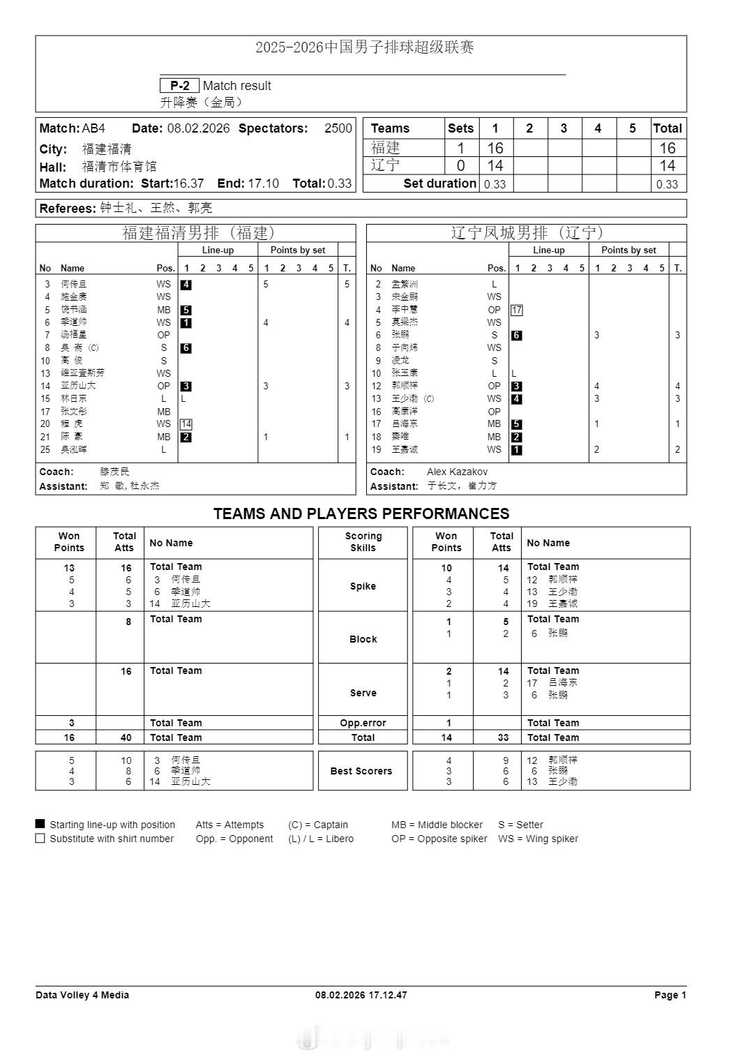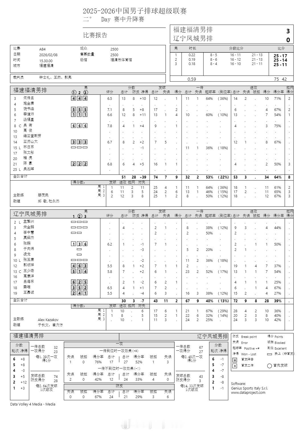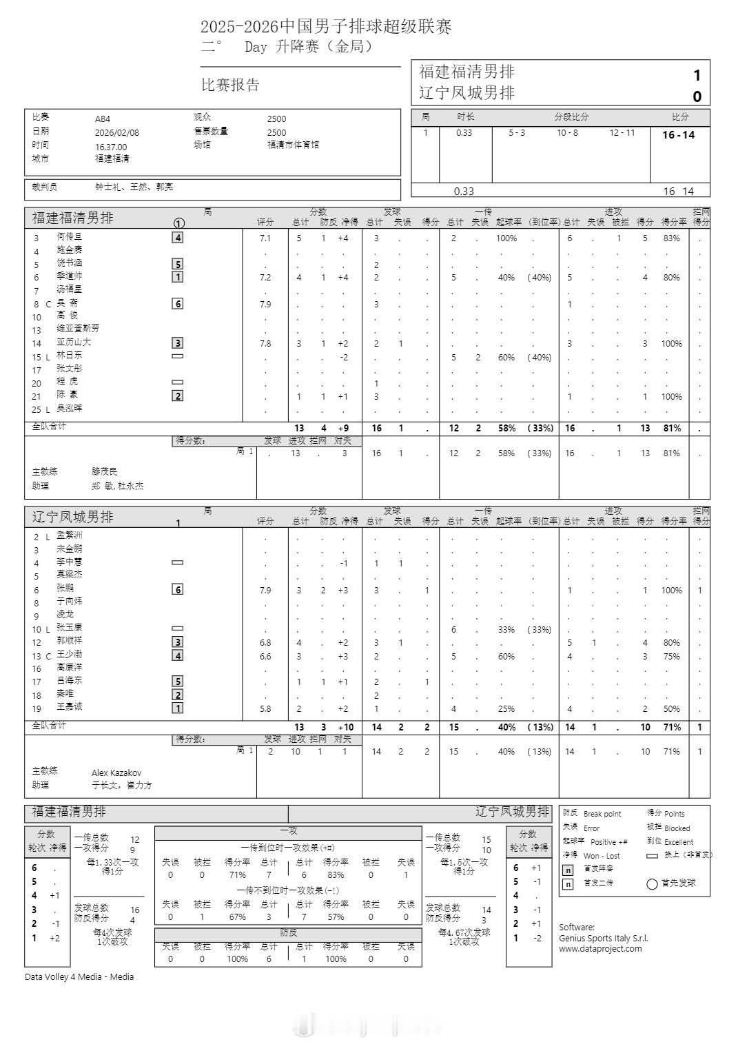 【排超男排升降赛闽苏金局绝杀辽浙】排超联赛 2月8日,排超男排联赛升降赛结束,福建和江苏分别通过金局绝杀辽宁和浙江,进入A级季后赛,辽宁和浙江则将参加B级季后赛。福建3-0(25-17/25-14/25-11,金局16-14)辽宁江苏1-3(27-25/23-25/21-25/14-25,金局15-13)浙江