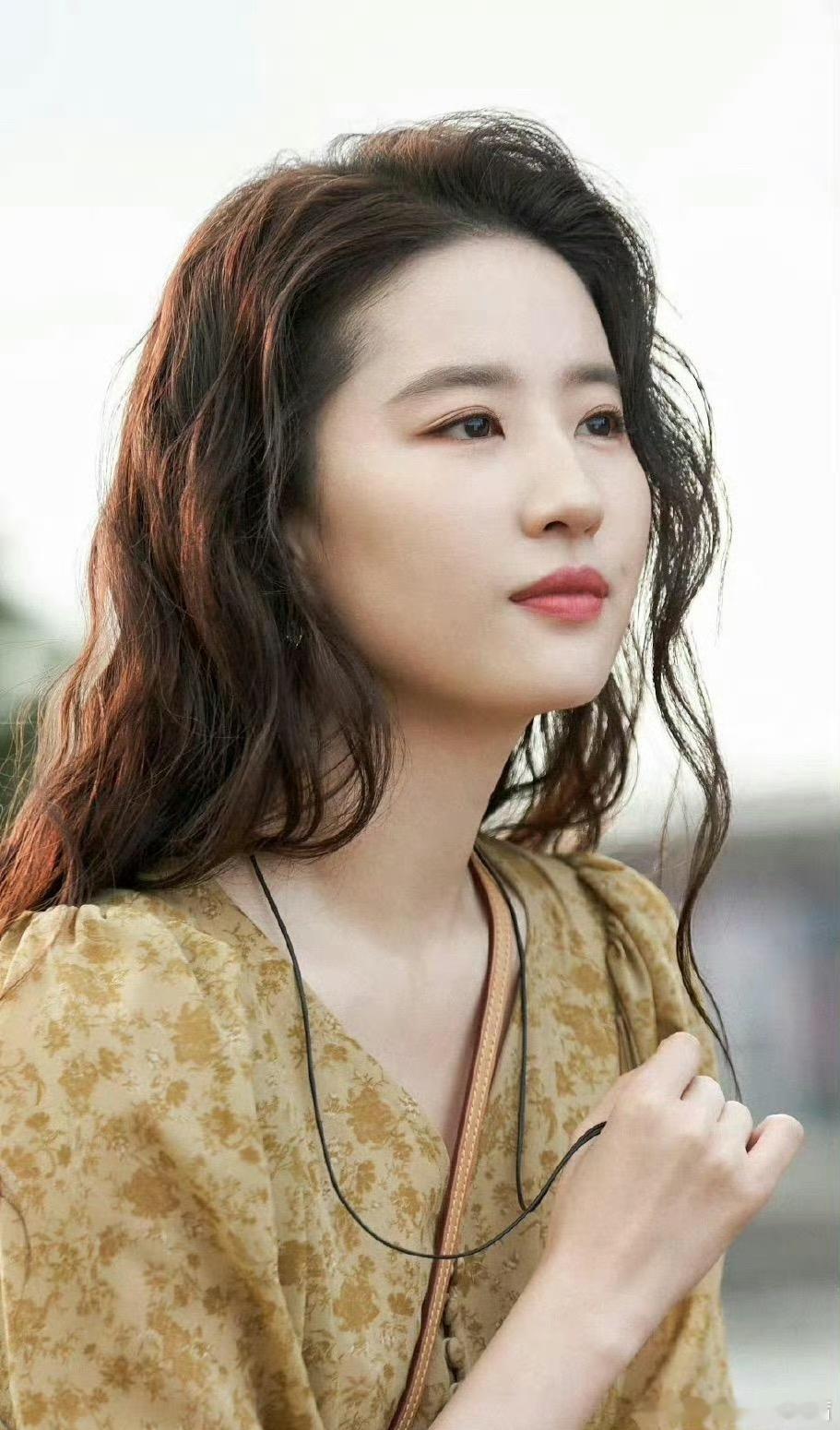 首先,我们来看看海滨氛围感穿搭。刘亦菲身着一件暖调的黄色碎花V领上衣,轻盈垂坠的面料随风飘动,搭配随性的羊毛卷长发,被海风吹得微乱,却更添了几分慵懒与故事感。