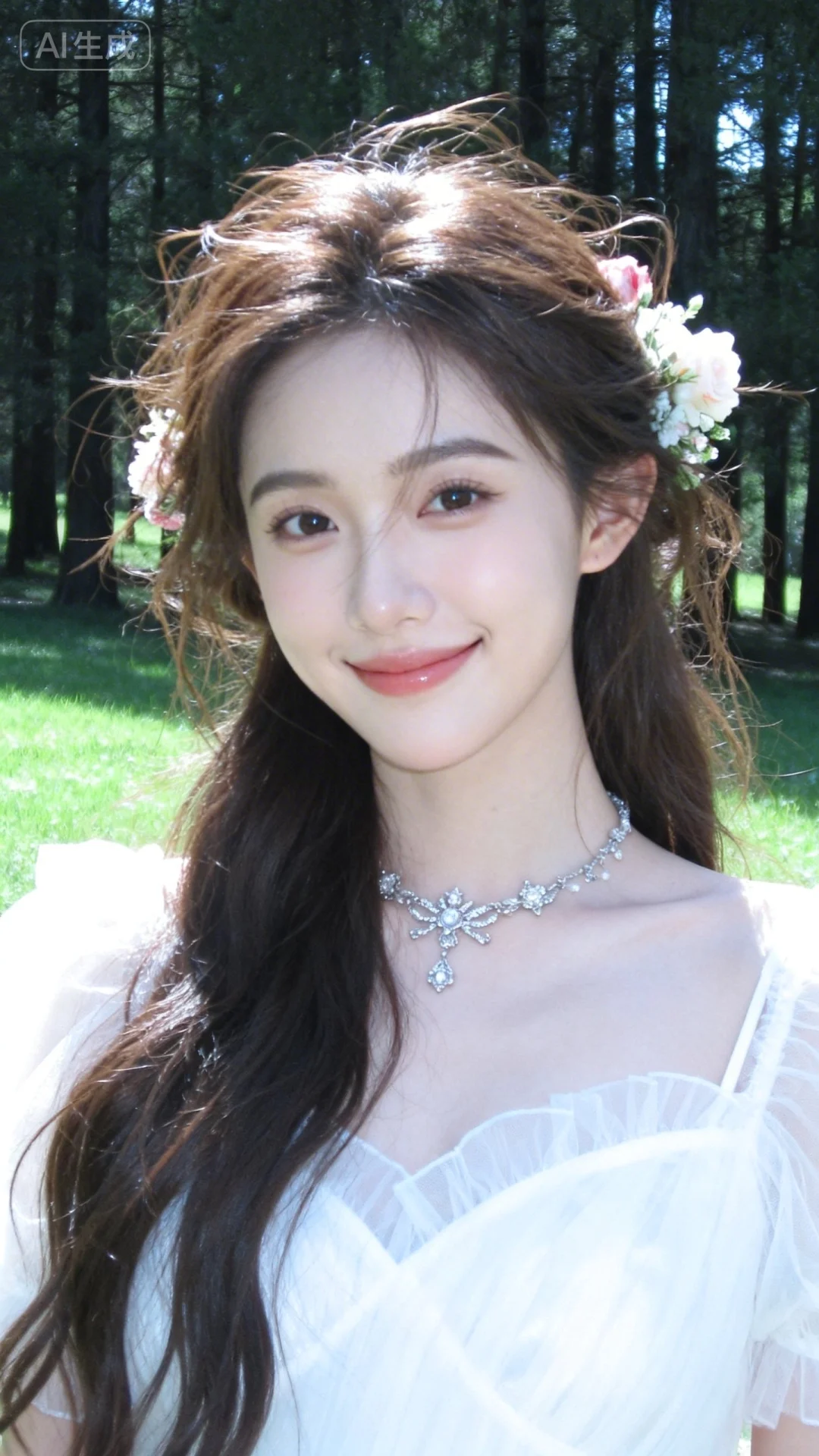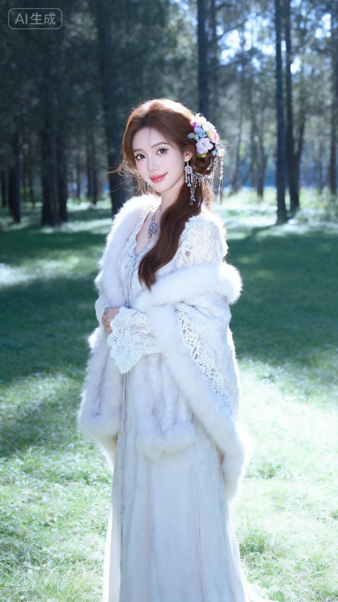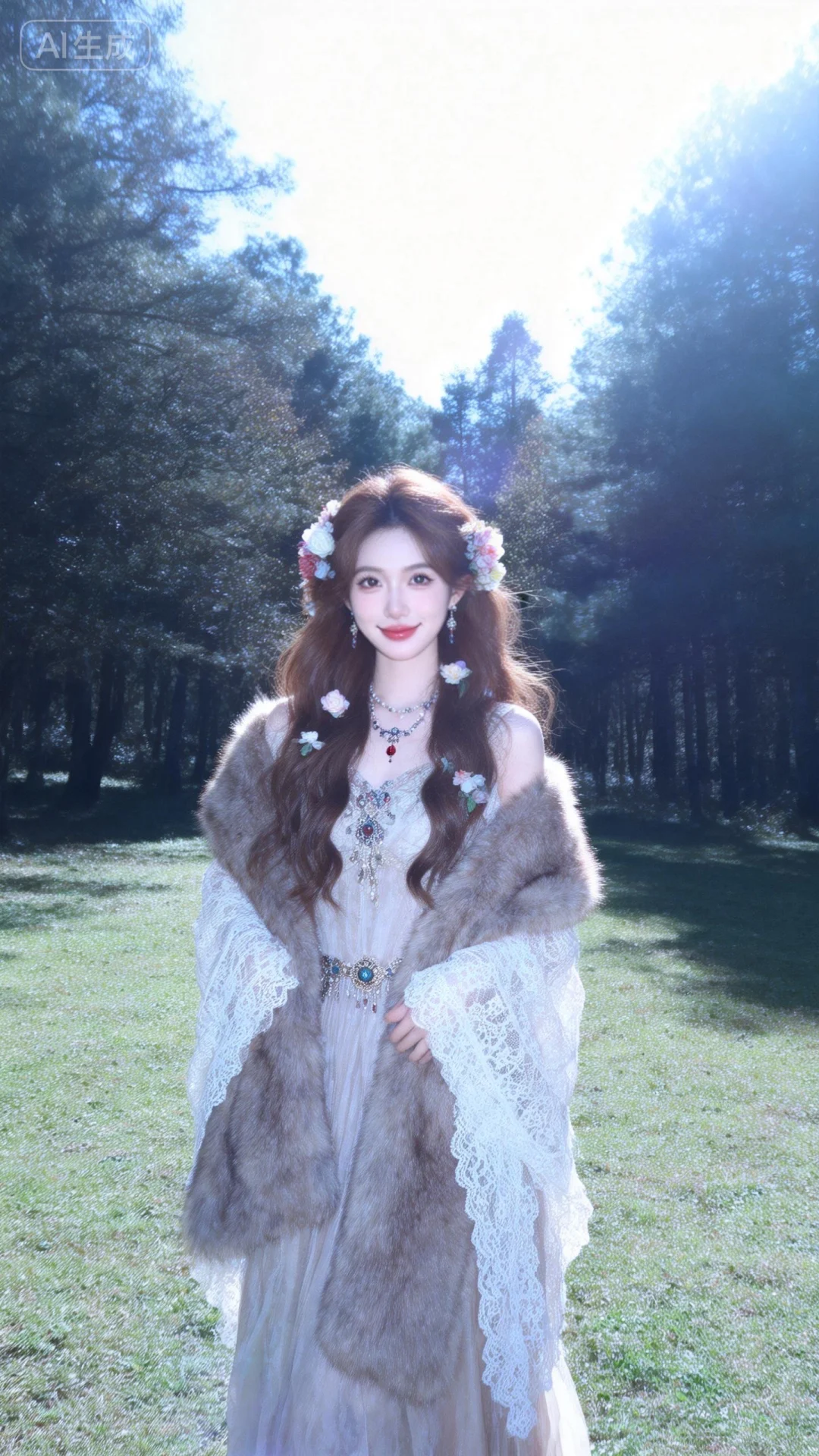 户外摄影,森系少女写真,草地上树林中,少女面部特写,嘴角微微上扬,精美饰品,棕色长发搭配花朵装饰,头发和花巧妙结合,极简风格,细节完美,五官精致,冷白色皮肤,气质高贵,冷艳气质高冷,毛绒森女系长裙,外搭毛绒蕾丝元素披肩,富士胶卷相片,阳光,曝光,清冷调一位漂亮的亚洲女生,大眼睛双眼皮,大方得体,端庄,自信,绝美容貌,长长的睫毛,微红的嘴唇,柳眉纤细,眼眸深情深邃,悬胆鼻,樱桃唇,女子五官、妆容精致,皮肤白皙,年轻貌美,完美身材,比例协调,神情温柔羞怯,每一处细节都仿佛是经过时光雕琢的艺术品。她的表情平静,如同静谧的湖水,超高清细节,整体光线亮白,真人真实写真风格,真实场景。超清晰摄影大师用光。超广角镜头,远景,全身照,有氛围感,超精细,细节丰富,色彩丰富多彩,超高清画质32k,摄影作品,人物脸部特写