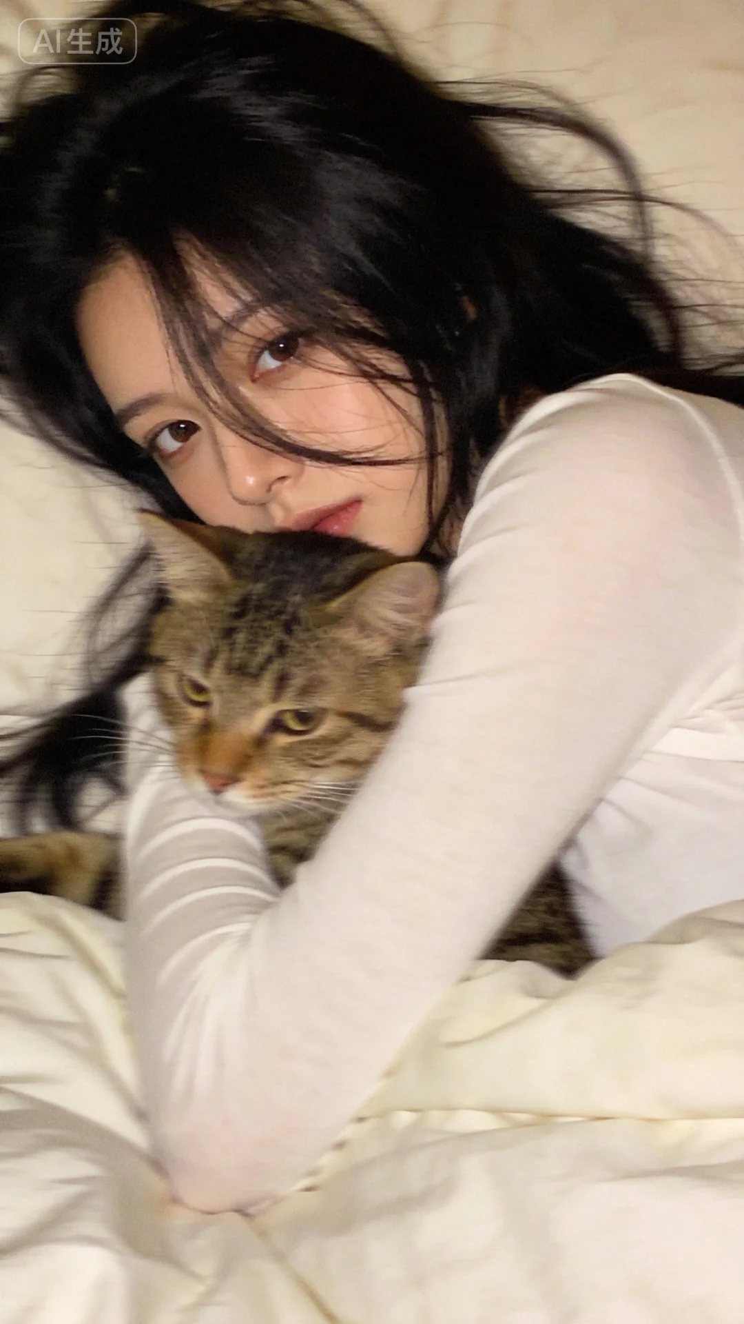 古早忧郁型,手机拍摄风格,超低分辨率,近距离面部特写,暖调日系滤镜,画面中是一位超级白、超级瘦、超级漂亮的冷白皮女子留黑色长发,些许发丝遮挡眼前,穿淡白色长袖上衣修身,盖着被子,呈半躺姿势,抱着猫,人物只露出眼睛,黑色长发自然散落在周围,画面朦胧感这是一个用平庸的iPhone 手机拍的照片,图片一点点动态模糊,构图拙劣,随手一拍的快照,不经意间的抓拍。