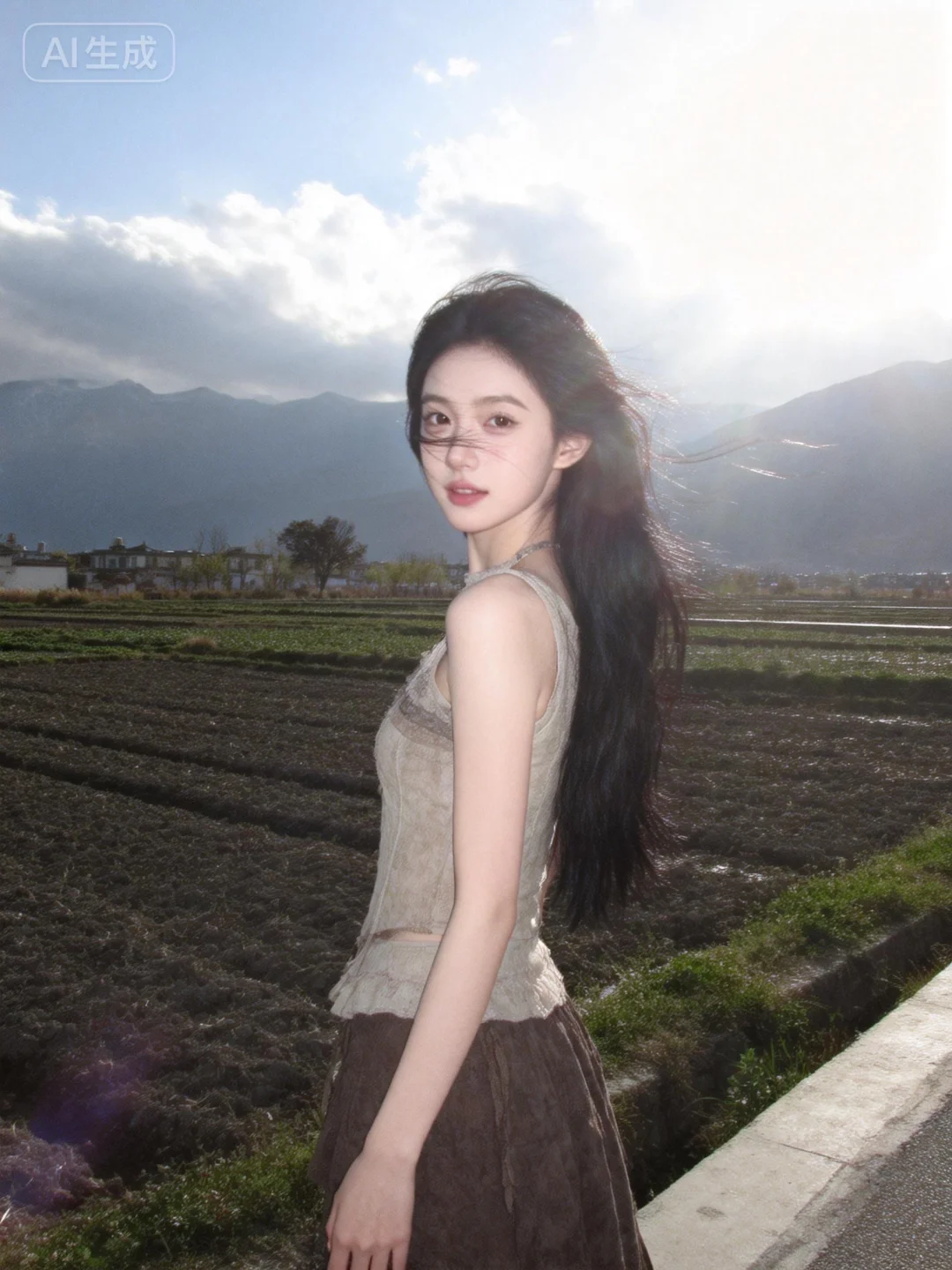 远景远景,身体占据图片的四分之一,全身照,可以看到全身,露出全身,动作慵懒,在大理田野上,晴天室外,自然风光美好,柔和光线笼罩出梦幻朦胧感,画面属氛围感情绪片,兼具CCD拍摄质感与大师作品格调。画面中是19岁冷白皮女生,黑色长发及腰,高鼻梁、瘦脸瘦身材,自带漂亮网红气质;她表情可爱自然、神态灵动随性,眼神真实不刻意(可看镜头或不看),整体呈慵懒松弛的休闲状态,阳光透过发丝洒在脸上更凸显肌肤通透感。画面带有轻微运动模糊(因快门速度不足)与轻微过曝(因阳光不均),保留了轻微噪点,做到高光不过曝、阴影有细节,无商业修图痕迹,贴近生活写实;女生身着合理搭配的服饰,软糯质感与清晰层次突出,构图随意无刻意感、无明确主体,像iPhone随意抓拍的生活日常,