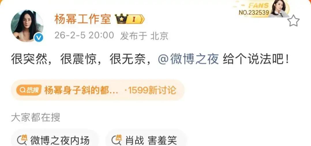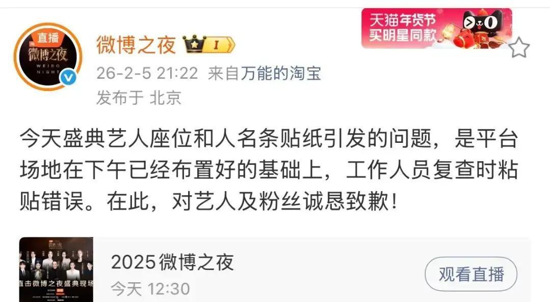 2月5日北京国家体育馆,微博之夜这场大典还没正式,就因为第二排座位名牌乱贴直接炸锅。 原本规划三人沙发,辛芷蕾稳坐中间C位,杨幂和肖战分列两侧,安排合情合理,毕竟辛芷蕾刚拿威尼斯影后,咖位摆在那。 结果临近入场,肖战的名牌突然被挪到旁边沙发,杨幂和辛芷蕾变成并排双人位,现场瞬间尴尬到不行。 肖战发现后直接没落座,主办方一看不对劲,赶紧让三人先离开,工作人员又手忙脚乱把名牌贴回去,最终恢复三人原位。 杨幂全程被动挨骂,工作室当晚8点直接发声:很突然,很震惊,很无奈,点名主办方给说法,短短一小时就冲上145万赞。 主办方9点多才回应,说是下午场地布置完后,工作人员复查粘贴出错,对艺人和粉丝诚恳道歉。 这场乌龙闹得前排好几排座位空荡荡,艺人们为避风头干脆不坐,粉丝现场喊退票,场面一度乱成一锅粥。 这种顶流盛典最该严谨的地方偏偏出岔子,一张名牌都能贴错,暴露主办方从前期统筹到现场执行的全链条松散。 艺人本该安心领奖,杨幂莫名背上“抢位”锅,肖战无端被挤边缘,主办方一句“工作人员失误”就想翻篇,诚意明显不够。 内娱活动再热闹,也得靠细节撑场面,细节崩了再多流量也白搭,这次闹剧就是活生生教训