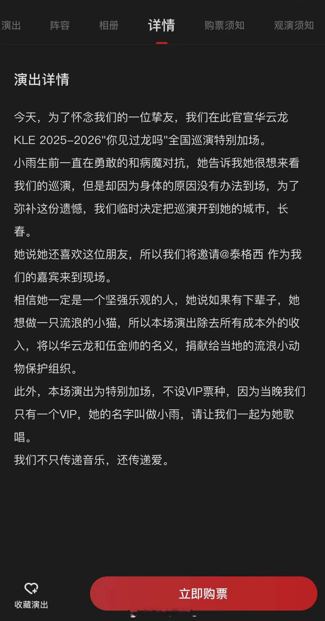 此外,本场演出为特别加场,不设VIP票种,因为当晚我们只有一个VIP,她的名字叫做小雨,请让我们一起为她歌唱。