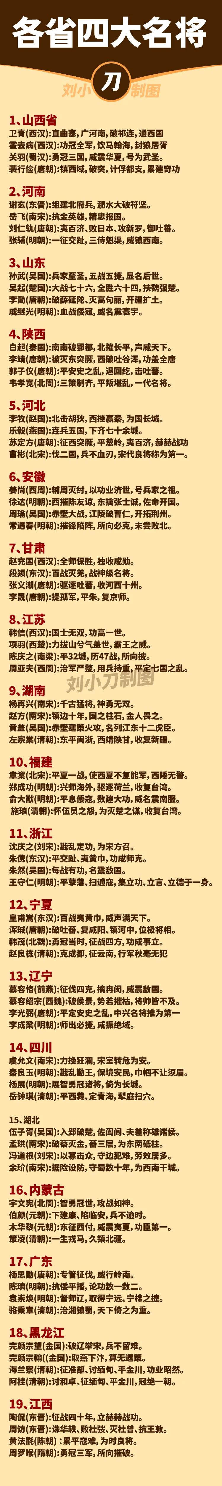 如果给各省份排出一个四大名将,那么哪个省份最厉害? 我认为最厉害的是山西。 如果论对外的话,山西的卫青大破匈奴,霍去病又有着华夏武将的最高荣誉封狼居胥。 蜀国的关羽被称为武圣,而三箭定天山的薛仁贵,也是唐朝的一位传奇战神。 不过陕西也丝毫不差。 白起是战国四大名将之首,王翦也是秦灭六国的最大功臣,还有唐朝的李靖和郭子仪,几乎可以说四人毫无短板,光是武庙十哲就占了两个。