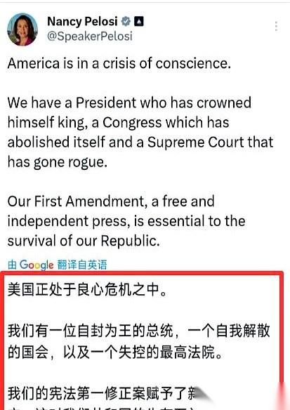 一个85岁的老太太,在美国政坛摸爬滚打快40年,突然把桌子掀了。 她直接在社交媒体上写:“美国正在良心危机里!总统自封为王,国会自行解散,最高法院彻底失控!” 字字句句,都像耳光一样,甩在特朗普脸上。 “自封为王”这个词,一点没冤枉他。特朗普当总统那会儿,国会不同意?没关系。他转身就签行政令,把权力这东西,用得明明白白。想干的事,谁也拦不住。 这不是她第一次动手。 当年特朗普站在国会山最耀眼的聚光灯下,唾沫横飞地念着国情咨文,而她就坐在他身后,面无表情地看着,等他最后一个词落地,抓起那份厚厚的讲稿,两只手一用力,“哗”一下当着所有镜头的面,撕成了两半,再撕成四半。 那股恨意,根本没想藏。 现在,她说国会“自行解散”,镜头转过去一看,真像。国会大厅里,两拨人坐得泾渭分明,空气里都是火药味。你提的,我必须否;我支持的,你必须踩。法案堆在桌上积了灰,也没人管。 至于“失控”的最高法院,那架象征公平的天平,早就歪了。法官袍子底下,藏着的是党派的标签。 当然,佩洛西也快退休了,2027年任期一到就走人。没了后顾之忧,话筒递到嘴边,自然什么都敢说。 特朗普那边也不含糊,立马隔空回骂,说她“邪恶”、“腐败”,是国家的累赘。 说白了,这不是两个老人的个人恩怨,是整套系统,齿轮跟齿轮开始对着干了。 有人说,她这是临走前说了句真话。也有人说,她这不过是党派斗争的又一次表演。 你觉得,一个快下台的人,说的话,是真话还是最后的算计?