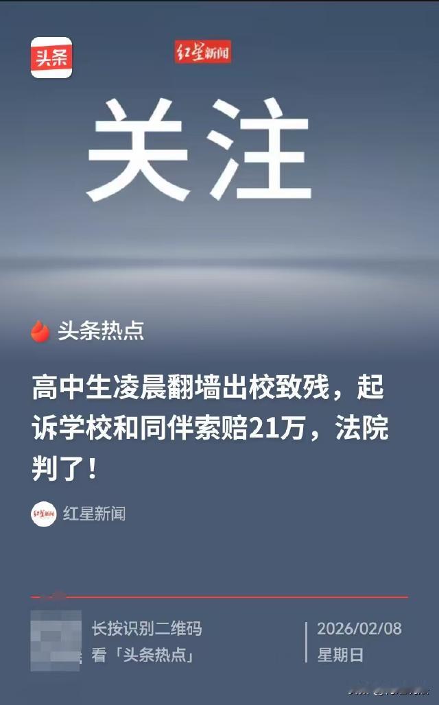 重庆,高中男生和三个同学凌晨翻墙出去打台球,翻墙过程中不慎脚滑摔倒,凌晨6点多钟,男生回校后觉得腰疼,校方立即安排两个老师陪同他去检查。经鉴定男生构成了九级伤残,男生的家属起诉校方及三名同学,索赔21万余元。 据红星新闻报道,小陈是重庆永川某职高的一名学生,可是,小陈对学习兴趣并不大,反而天天想着玩。 2024年4月的一天,小陈和同学龙某等人商议,等晚上查完寝后,一起从宿舍翻墙出去打台球。 晚上,到了熄灯时间,宿舍楼逐渐陷入黑暗,查完寝后,小陈等人并没有着急行动,他们知道,这时候外面还有老师在巡查,一定得等到所有人都睡了才保险。 终于,时间来到凌晨,小陈、小龙四人顺着下水道管爬下宿舍楼,谁知,在翻墙的时候小陈不慎摔了一跤。 当时,小陈感觉腰摔到了,但是休息了一会后,他觉得没有大碍,于是按照原计划,和三个同学从操场防护网里的破洞钻了出去。 四人一玩就是一夜,一直到早上6点多钟才返回宿舍。 小陈躺在床上,只觉得腰越来越疼,于是赶紧告诉了班主任。 班主任非常重视,将这件事上报,校方安排了两个老师陪着小陈一块去就医。 后经鉴定,小陈这一摔可不轻,造成了九级伤残,而小陈此次受伤造成的损失,高达21万余元。 小陈家里条件普通,这笔钱对他们来说,是一笔沉重的负担。 于是,小陈的父母将校方及当天和小陈一同外出的三名同学及他们的监护人一同起诉了,要求他们共同赔偿21万余元。 庭审时,小陈的父母提出,校方未履行教育管理职责,存在一定过失,应当承担一定责任。 小龙等三人作为同行者,没有尽到提醒照顾义务,小陈摔倒后,三人也没有及时将他送医或者上报学校,三人也存在一定过错,应该承担一定责任。 1、校方是否需要担责? 《民法典》第一千二百条规定,限制民事行为能力人在学校或者其他教育机构学习、生活期间受到人身损害,学校或者其他教育机构未尽到教育、管理职责的,应当承担侵权责任。 庭审时,校方辩解称,他们每年都会开展常态化安全教育,学校规章制度明确规定严禁攀爬护栏。 这表明,校方在日常管理中已经履行了教育和管理义务。 小陈受伤告知班主任后,校方立即安排老师陪同就医,及时采取了救助措施。 所以,校方在整个事件中已经尽到了合理范围内的职责,不需要对小陈的违规冒险行为承担额外责任。 2、小龙等三人是否应该担责? 《民法典》第一千一百六十五条,行为人因过错侵害他人民事权益造成损害的,应当承担侵权责任。 小陈小龙等四人相约以爬墙的方式外出,违反校纪校规,小龙等三人和小陈之间本应尽到提醒、照顾的互助义务。 但是,小陈爬墙时,小龙等三人并没有提醒他可能存在的危险,未充分履行提醒义务。 小陈摔倒后,三人也没有未及时送医并告知校方,存在一定过错。 但是,小陈摔倒后仍然坚持出去打台球,小龙三人根据小陈的表现,并不能推断小陈当时的状态,也不能判断小陈当时需要就医, 并且,小龙三人没有及时送小陈就医,其行为未明显加重病情,所以三人过错程度较轻,应承担与其过错相适应的责任。 3、小陈自身应承担主要责任。 案发时,小陈已经年满16周岁,作为限制民事行为能力人,应当对自己的行为有一定的认知和判断能力。 小陈主动参与翻墙外出的危险行为,对自身安全没有尽到应有的注意义务,是导致此次受伤的直接原因。 根据《民法典》中关于过错责任的规定,小陈自身的过错是造成其损害的主要因素,应承担主要责任。 最终,经审理认为,小陈受伤,他自身应当承担主要责任。 小龙等三人虽然存在一定过错,但是过错程度较轻,结合本案的发生,酌定三人每人赔偿小陈7000元。 校方在此事中不存在过错,无需承担责任。