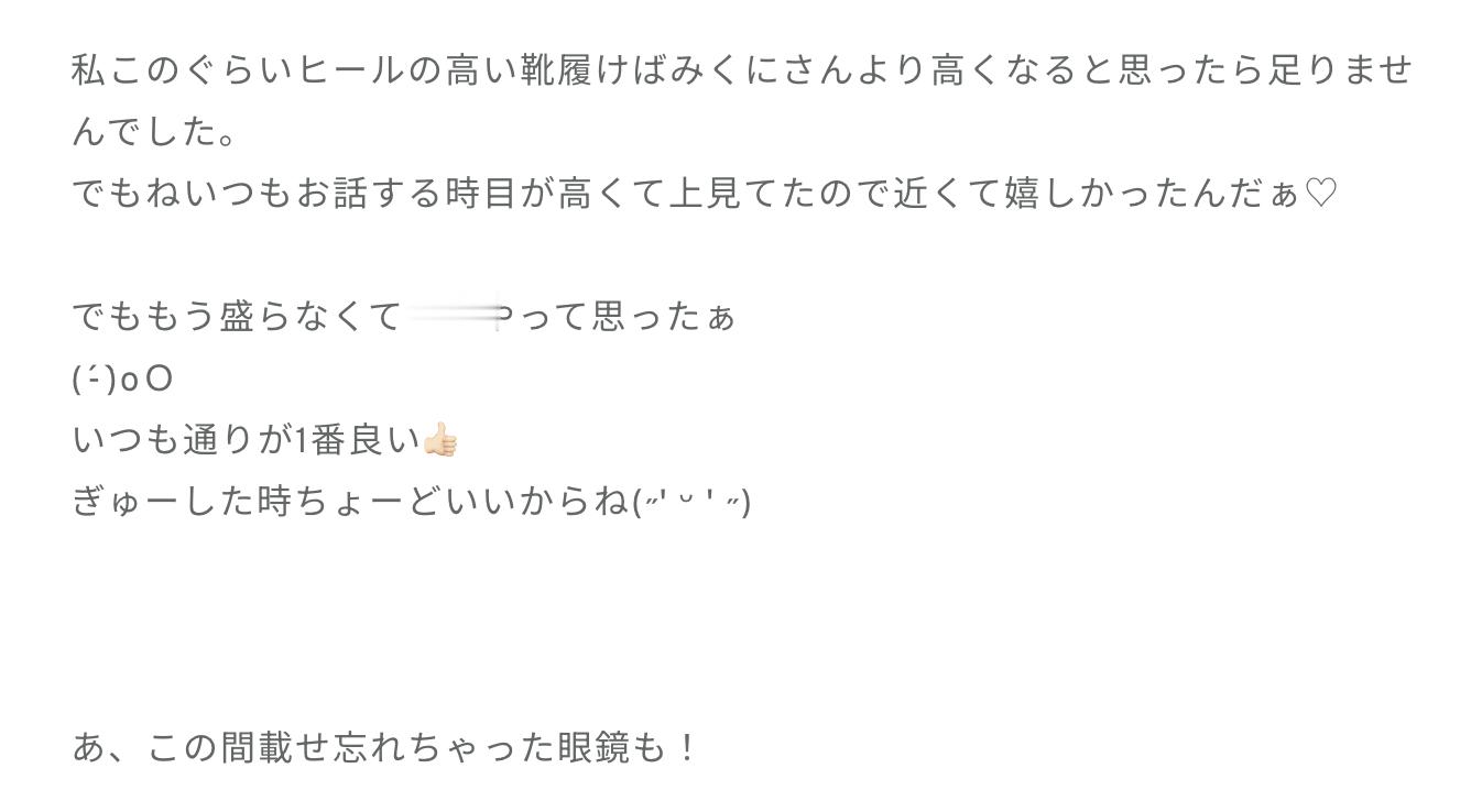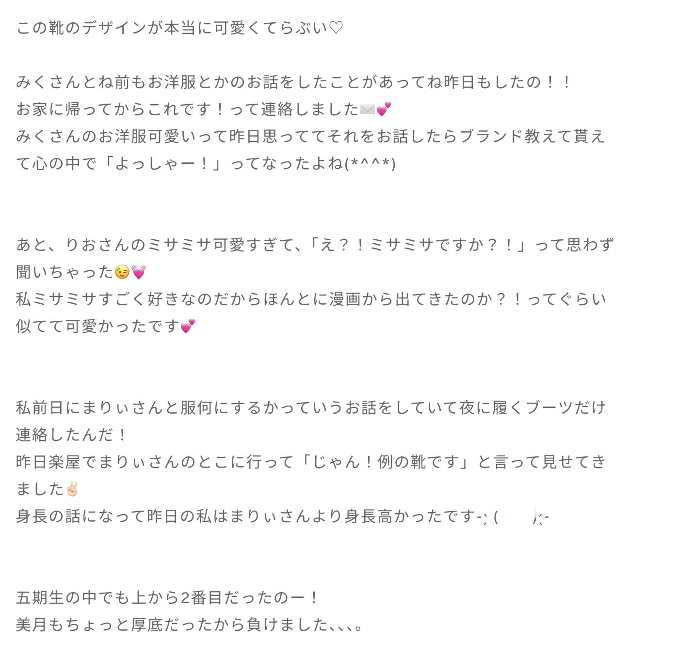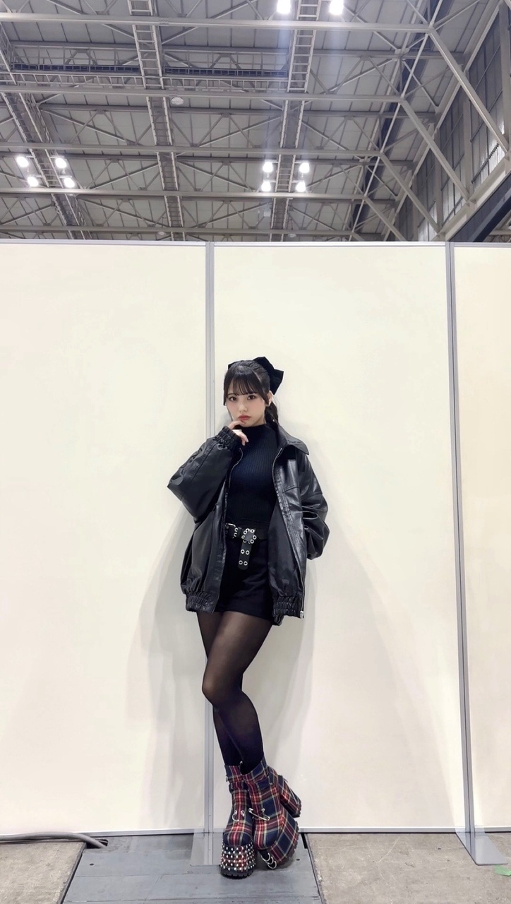 下田衣珠季「あああ私、服の紹介をしたかったの。靴がメインです♡靴が派手なので他は黒で統一!靴に合わせてベルトも同じ系統にしたのぉ。ベルトね、横にびよーんってなるのが嫌だったから結んでみたらいい感じになったの(˶' ᵕ ' ˶)もちろんリボンも!かっこよくなりすぎちゃうからリボンしてガーリーぽさもプラスしたの!こんなにヒールの高い靴初めて履いたよぉ。いつもと景色が違って楽しかった!皆と目線が近くて嬉しかったぁ!ちなみにこの靴履いた時は169cmになるの!♩」