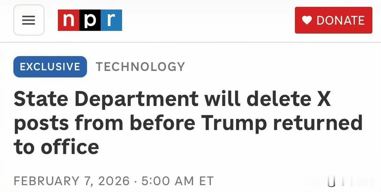 据美国国家公共广播电台,美国国务院的所有X账号,将删除阿川这次上台前的所有帖子。 包括美国驻各国使馆领馆,国务院下属单位,国务院附属或区域性账户。2月20日前完成。 所以要翻美国驻华大使馆旧账的,也得赶紧保存了。