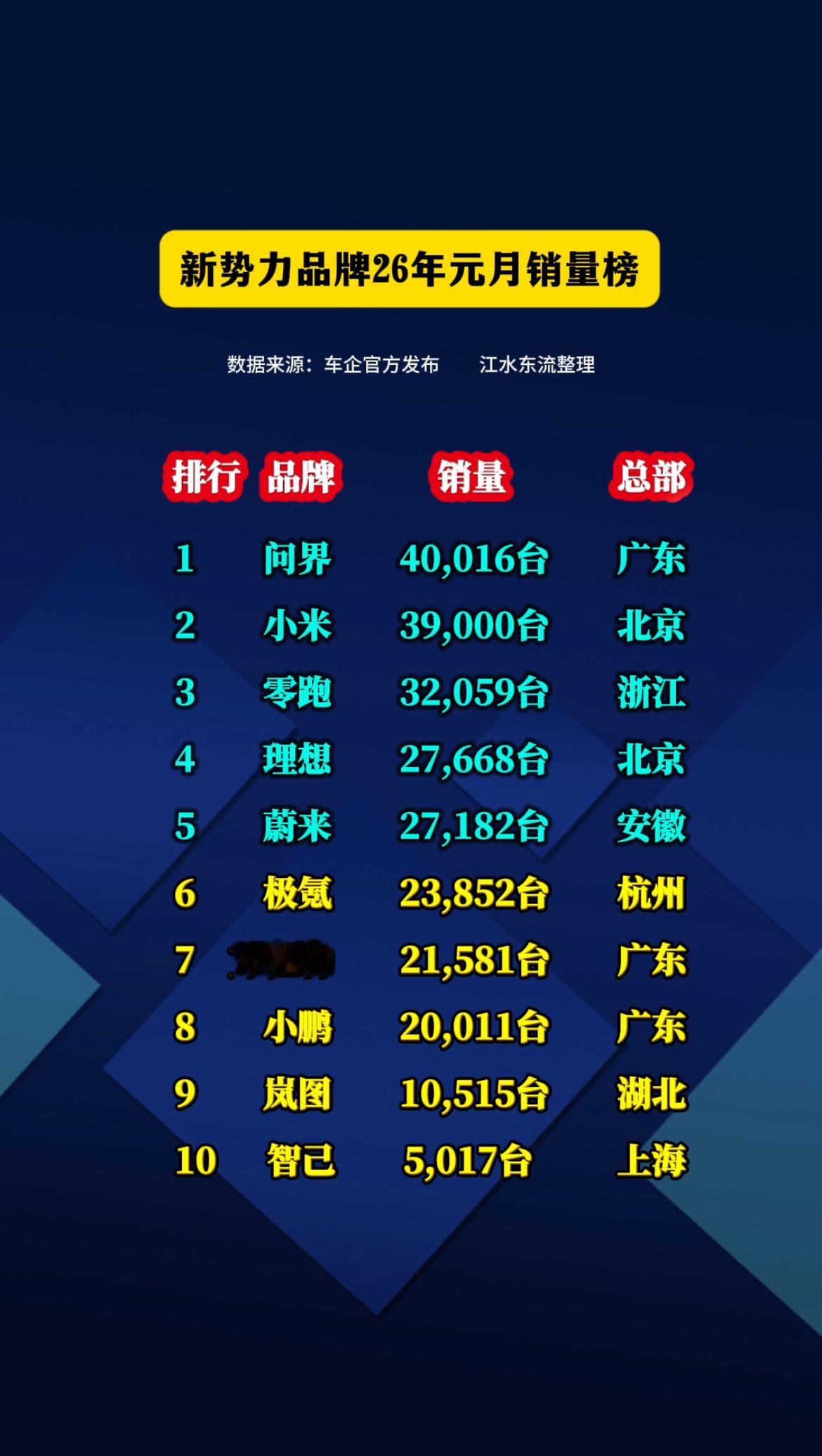 新势力品牌26年元月销量榜!新势力车企 新能源 问界 蔚来 销量榜