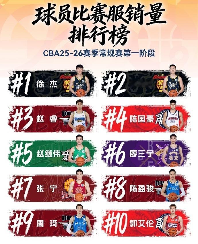 CBA最新消息:近日,CBA官方合作品牌公布了常规赛第一阶段球员球衣销量TOP10,广东男篮和北京男篮成了最大的赢家,今年全明星票王徐杰依旧排名球员销量第一的位置,而他的广东男篮队友胡明轩则位列第二,北京男篮的赵睿、陈盈俊和周琦分别位列第三、第八和第九的位置,而曾经的亚洲第一后卫郭艾伦尽管近几个赛季因伤病出场较少,但依旧排名第十,足以说明郭艾伦的人气依旧在线。以下是排名球员前十的球员名单依次是徐杰、胡明轩、赵睿、陈国豪、赵继伟、廖三宁、张宁、陈盈骏、周琦和郭艾伦。 CBA联赛 广东