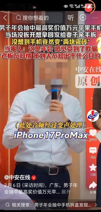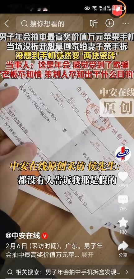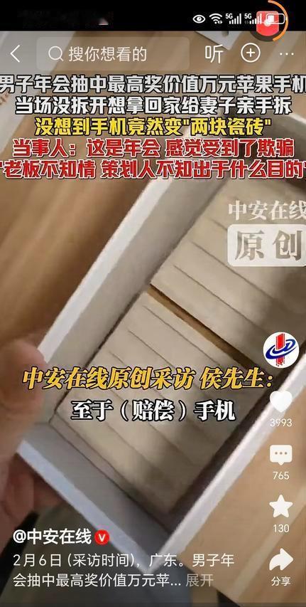 “玩不起别玩!”2月6日报道,广东,一男子参加公司年会,抽中一部9988元的手机,老板郑重给他颁奖,男子高兴的拿回家里,想给妻子一个巨大的惊喜,谁知妻子打开,里面是两块瓷砖,可把男子给气坏了,这是欺骗!他到公司一问,就连老板也不知情![太阳] 近日,广东珠海某科技公司年会现场,员工江先生从抽奖箱中抽出了特等奖号码。 老板当场宣布奖品是一部价值9988元的最新款苹果手机,并亲手将包装完好的手机盒交到他手中。 江先生捧着奖品回到家,打算给妻子一个惊喜。 结果妻子拆开包装后,两人却发现盒子里装的不是手机,而是两块普通瓷砖、几颗糖果,以及一张明显造假的购物凭证。 事后调查显示,这个恶作剧出自公司策划部门主任之手。 这位主任对外解释称,设计这个环节是想让年会更有趣,江先生得知真相后表示,自己可以放弃这部手机,但要求策划者必须在2月10日全体员工大会上当众道歉。 公司管理层回应称,老板事前并不知情,目前公司已经向江先生补发了一部真正的苹果手机,同时给予涉事主任记过处分,并扣除其三个月的绩效奖金。 这起事件在社交平台引发大量讨论,多位法律从业者指出,企业在年会上当众承诺的奖品构成对员工的契约义务。如果蓄意不履行承诺,可能触犯虚假宣传或欺诈的法律红线。 年会抽奖本应是企业回馈员工辛劳的方式,奖品是否贵重并非核心,关键在于这份心意是否真诚。 当承诺的礼物被暗中替换,即便后来补发真品,那种被戏耍的感觉也难以消除。 这类整蛊行为暴露出策划者对员工感受的忽视,设想一下,江先生在同事们羡慕的目光中捧着奖品离开,回家后却发现被愚弄,这种从云端跌落的心理落差远超一部手机的价值。 管理者可能觉得开个玩笑无伤大雅,却没意识到这种玩笑是在消耗员工对公司的信任,一旦信任出现裂痕,再多的补救措施也只是亡羊补牢。 就像有网友说的:“今年年会你糊弄我,明年工作我糊弄你。” 不过也有人猜测,正常来说老板不会蒙员工的,年会费用是提前审核的,很可能是下面的人掉了包。 还有网友分享:“以前我们单位发生过一模一样的事情,结果中奖人还发了不少红包,后面发现是个模型,中奖人是城投公司领导,尴尬死了。” 那么,想问问各位网友:如果你在年会上遇到这种恶作剧,你会怎么做?