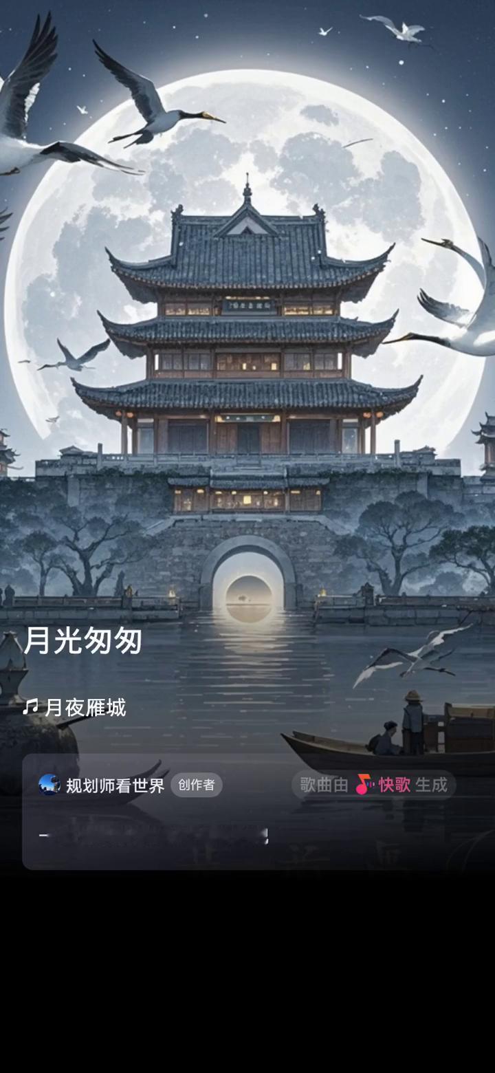 快歌ID:193111163。 规划师看世界创作者。 歌曲由快歌生成,一起来听听我创作的歌曲吧。 月哟月哟,月亮慢慢雁阵中爬升,月光夜色缓缓雁城降临,银丝带轻舞徐徐浪漫的迷津,雁峰深境,月光细细把梦幻浸润,月亮勾起雁雁往日温馨,码头热热闹闹失去了喧嚣声,月光朦朦胧胧中船影纵横,那裂岸波涛音,月光里漫漫永恒雁影,石鼓书院醺醺醉倒了雁阵,角落处处书香温柔月情,月光中悠悠伸腰苏醒,月哟月哟,月亮眷恋脉脉愈发浓情,月光下雁城亮亮历史的背影,时光悠悠月色皎皎沉醉在心境,月光清清亮亮光芒玉石晶莹,月亮跨跨风雨依旧那么灵,月光匆匆,月亮串起雁阵风景,月亮始终鸿雁深情,月光绊绊,月亮盼望雁城新景,月光下雁城诤诤誓言多坚定,雁阵阵阵在脑海中翻涌,雁相伴城,见证着雁城一路的奋进。 快歌ID:193111163,更多精彩内容上快歌,用音乐表达生活。