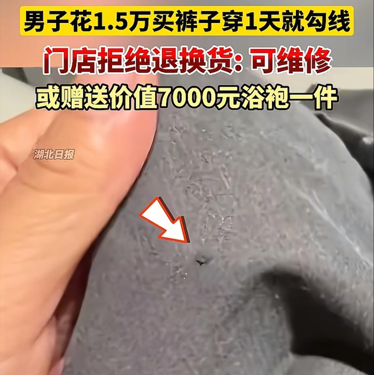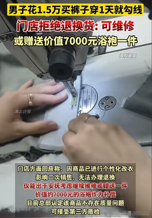 陕西西安,男子花15000多买了一条裤子,穿了1天就勾线了,商家拿回去修补后,男子觉得效果不明显,要求对方换货或者退货,可对方给出的解决方案,让他失望至极。网友:贫穷限制了我的想象。 西安这名男子平时对穿搭比较讲究,前段时间在西安一家高端商场逛街时,看中了一条裤子,版型和面料都很对他的心意,虽然标价15580元,价格不算便宜,但他觉得一分钱一分货,贵有贵的道理,纠结了没多久就果断付款买下。 因为裤子版型需要适配自己的尺寸,购买当天他就请商场门店的工作人员帮忙做了裁边处理,工作人员承诺会妥善处理,之后会按时把裁边后的裤子送到他手上。男子满心期待,拿到裤子后更是格外爱惜,特意放了几天,没有立马穿着,就怕不小心损坏。 几天后,男子特意选了一个合适的场合,第一次穿上这条高价裤子出门,全程都格外小心,只是在写字楼里处理正常的工作事宜,没有做任何剧烈动作,也没有接触任何尖锐物品,连坐的时候都特意放慢动作,生怕刮到裤子。 可谁能想到,仅仅穿了一天,晚上他回家整理衣物时,突然发现裤子的裤腿处,出现了一道明显的勾线痕迹。 原本平整光滑的面料上,这道勾线格外扎眼,不仅破坏了裤子的整体美观,更让他无法接受的是,这和它一万五千多的售价,实在太不匹配。 男子当即就拍下照片留存证据,第二天一早就联系了当初购买裤子的门店,说明裤子仅穿着一天就出现勾线的情况,怀疑裤子本身存在质量问题, 希望商家能给出合理的处理方案。门店工作人员接到反馈后,让他把裤子送回门店,先进行检查和修补。 男子没有多想,立马按要求把裤子送到了门店,满心以为商家能好好修补,尽量恢复裤子原本的样子,毕竟是一万多的东西,哪怕修补后看不出明显痕迹,他也能接受。可等到他按约定去取修补后的裤子时,瞬间就傻了眼。 经过修补的勾线部位,痕迹依旧清晰可见,远远就能看出来,和裤子其他部位的面料质感完全不一样,根本达不到他的预期,甚至可以说修补效果几乎可以忽略不计。这样的状态,别说穿出门,就算是在家穿,他心里也觉得不舒服。 于是,男子当场就向门店提出了换货要求,他明确表示,自己穿着期间完全正常使用,没有任何人为损坏的行为,裤子仅穿一天就勾线,大概率是面料或者工艺上存在瑕疵。如果门店无法满足换货的要求,他也可以接受退货,只想挽回自己的损失。 可让他没想到的是,门店工作人员当场就拒绝了他的退换货要求,给出的理由是,这条裤子已经做了裁边的个性化处理,裁边后无法再次销售,影响二次销售,所以不符合退换货的条件,不能为他办理换货或退货。 看着男子不满的情绪,门店随后又给出了两个补偿方案,让他二选一:要么继续把裤子留在门店,工作人员会再次进行维修,尽量优化修补效果;要么门店赠送他一件价值约7000元的浴袍,以此弥补裤子勾线带来的损失。 这样的解决方案,让男子彻底失望至极,他觉得这两个方案都无法解决根本问题,继续维修也未必能有好效果,而一件浴袍,根本弥补不了他买高价裤子的损失。 据悉,门店还表示,品牌总部已经核查过,认定裤子不存在质量问题,若男子不认可,可以找第三方专业质检机构检测,若检测出质量问题,会依法处理。 此事被分享到网上后,迅速引发热议,不少网友调侃,果然有钱人的世界看不懂,也有网友吐槽商家的处理方式太敷衍。对此,你们有什么看法,欢迎评论留言~