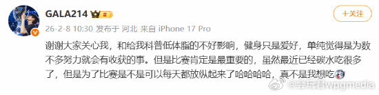 《英雄联盟》Gala回应健身晒腹肌:为数不多努力就会有收获的事之前报道,《英雄联盟》JDG战队AD选手Gala微博晒腹肌引发网友热议,随后Bin哥强势入局将健身事件推向新的高潮。8日,Gala首度回应健身事件,谦虚的表示“健身只是爱好,单纯觉得是为数不多努力就会有收获的事”,引来网友点赞。原文如下:“谢谢大家关心我,和给我科普低体脂的不好影响,健身只是爱好,单纯觉得是为数不多努力就会有收获的事。但是比赛肯定是最重要的,虽然最近已经碳水吃很多了,但是为了比赛是不是可以每天都放纵起来了哈哈哈哈,真不是我想吃。”随后他本人在评论区表示自己也只是新手,对于网友对自己饮食以及训练的询问,就不露怯了。