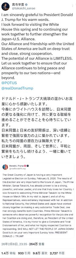 胜选后,日本首相高市早苗第一时间用日文英文双语感谢特朗普:“我衷心感谢唐纳德·J·特朗普总统的亲切话语。我期待着今年春天能访问白宫,并继续与您合作,以进一步巩固日美同盟关系。我们与美国的联盟关系以及友谊建立在深厚的信任以及紧密、强有力的合作基础之上。我们联盟的潜力是无限的。让我们携手努力,确保我们的联盟能够继续为我们的两国乃至更多地区带来和平与繁荣。” 【高市早苗还贴出了特朗普前几日赞扬高市早苗并邀请她3月19日访美的推文。】 咱们来仔细琢磨琢磨高市早苗这一系列操作。她刚一上台,就急着向特朗普示好,这背后肯定有不少考量。日美同盟对于日本来说,那可是外交和安全方面的“顶梁柱”。这么多年来,日本在国际舞台上能有一定的话语权,很大程度上靠的就是和美国绑在一起。 从安全层面看,日本在军事上一直受美国庇护。美国在日本有大量的军事基地,驻扎着不少美军。这些美军就像是日本的“保护伞”,让日本在面对周边一些潜在威胁时,心里能有点底。而且,通过和美国的军事合作,日本还能接触到一些先进的军事技术和装备,提升自己的军事能力。 在经济方面,日美之间的贸易往来那也是相当密切。美国是日本重要的贸易伙伴之一,双方在汽车、电子产品等众多领域都有广泛的合作。高市早苗肯定希望借助和特朗普的这层关系,进一步推动日美之间的经济合作,为日本的经济增长创造更多机会。 不过,高市早苗这么急着向特朗普靠拢,也不是没有风险。一方面,过度依赖美国可能会让日本在国际事务中失去一定的自主性。美国在国际上的政策往往是从自身利益出发,有时候可能会要求日本在一些问题上做出让步。如果日本一味地迎合美国,可能会损害自身的利益。 另一方面,日美同盟的强化也可能会引起周边国家的警惕。在历史问题上,日本和周边一些国家还存在不少矛盾。如果日本和美国走得太近,在军事等方面进一步加强合作,周边国家可能会担心日本会再次走上军国主义道路,从而对地区和平与稳定造成威胁。 对于高市早苗的这番表态,国际社会也都在密切关注。美国方面自然是乐见其成,特朗普的赞扬和邀请就说明了他对加强日美关系的积极态度。毕竟,美国也希望通过巩固和日本的同盟关系,在亚太地区维持自己的影响力。 而周边国家则态度各异。一些国家可能会对日美同盟的强化表示担忧,担心这会影响地区的和平与稳定。另一些国家则可能会保持冷静观察,看看日本在实际行动中会如何平衡与美国的关系以及对地区的影响。 回到日本国内,高市早苗的这番操作也可能会引发不同的声音。一部分人可能会支持她加强日美同盟的做法,认为这能为日本带来更多的利益和安全保障。但也有一部分人可能会担心过度依赖美国会让日本失去自我,而且在历史问题上,日本应该更加谨慎地处理和周边国家的关系,而不是一味地和美国走得那么近。 不管怎么说,高市早苗上台后第一时间向特朗普示好,这一事件已经在国际舞台上引起了不小的波澜。日美同盟未来的走向如何,日本在国际事务中会扮演怎样的角色,这些都还有待进一步观察。但可以肯定的是,这一事件将会对亚太地区的政治、经济和安全格局产生一定的影响。