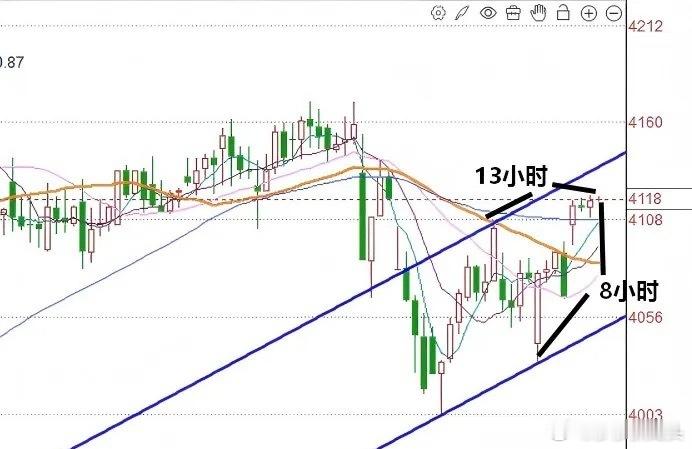 现在是下午的2:06截止目前为止,上证指数涨1.29%比上午收盘时候的涨幅又扩大了一些。下午市场的最高点已经到达4120点。从上证指数60分钟K线图来看,60分钟级别,缓慢的重心上移。但是还没有到达60分钟级别,上升通道上轨的压力位。在今天早上的时候莎莎就明确告诉大家,市场60分钟级别的压力点大概率出现在4138点。目前离4138点还有一点点空间。但是空间也并不是很大。同时大家注意一下时间的关系。从时间关系上来看,60分钟级别低点到高点,已经到达第8个小时。高点到高点,也到达了第13个小时。8和13都是典型的斐波纳契变盘数字。所以就是说,接下来市场大概率会在今天下午或者明天上午的第1个小时见到短线的小高点,然后短线可能会有一个震荡的走势。