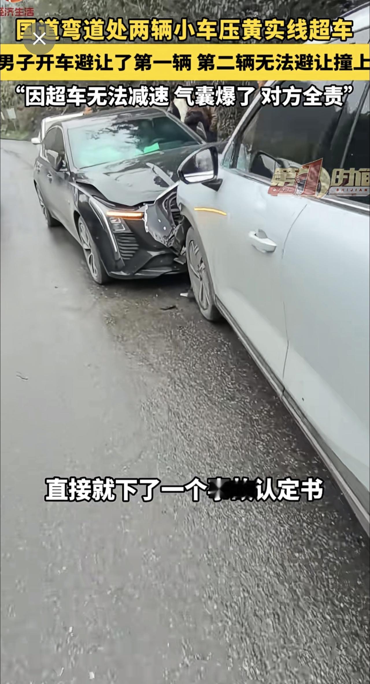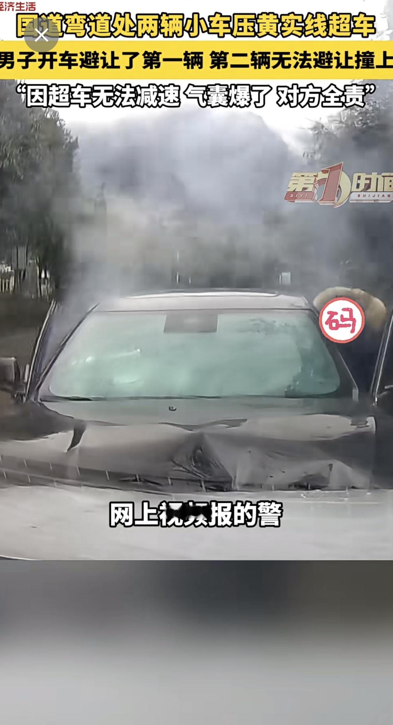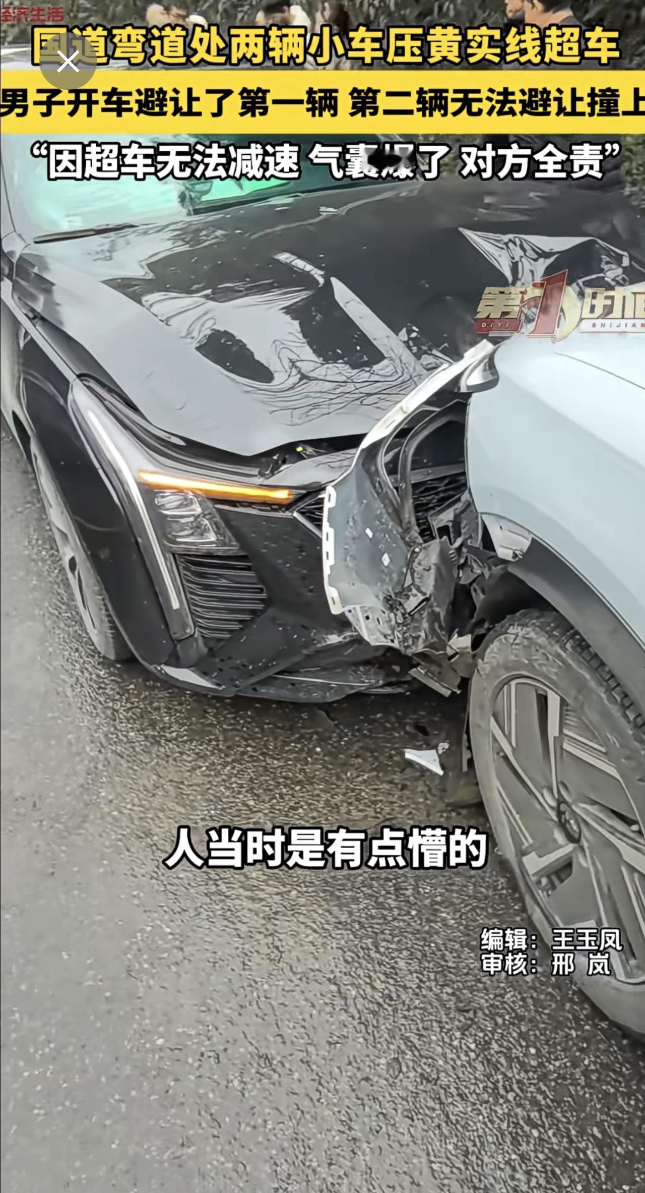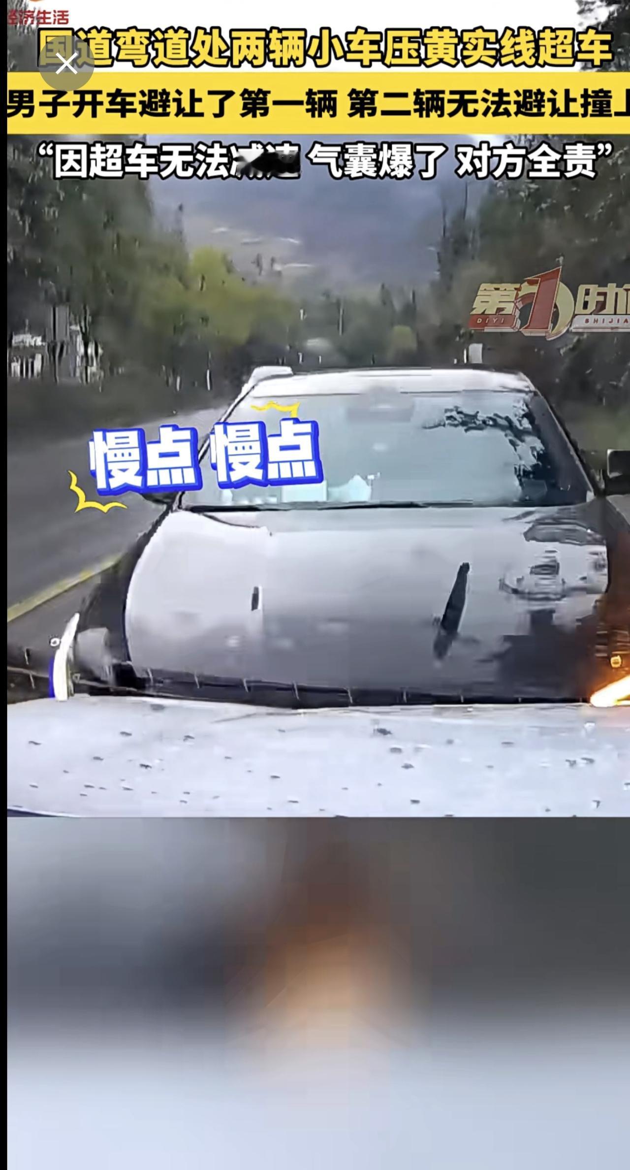 国道弯道处两辆小车压黄实线超车,男子开车避让了第一辆,第二辆无法避让撞上。交通事故