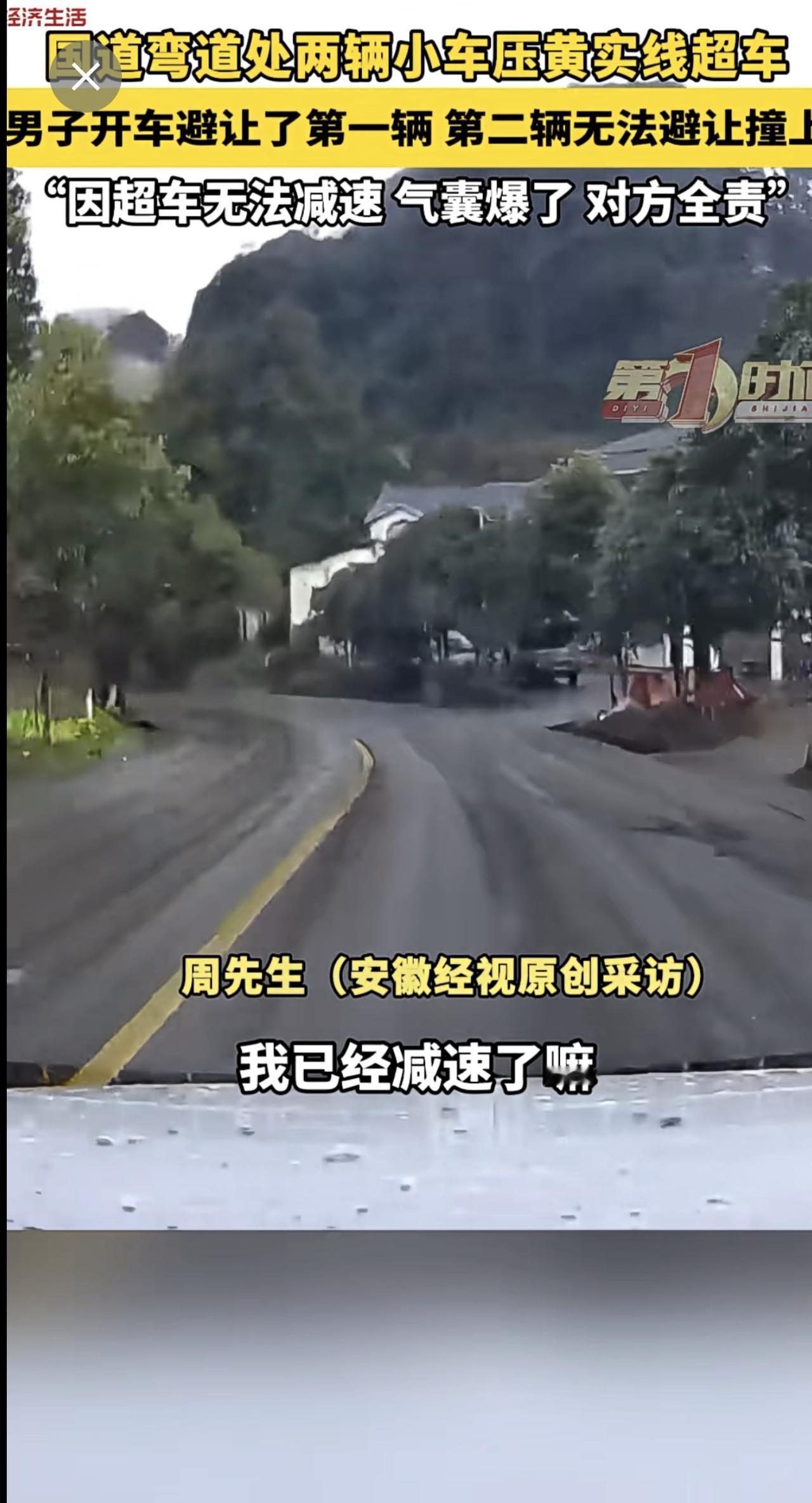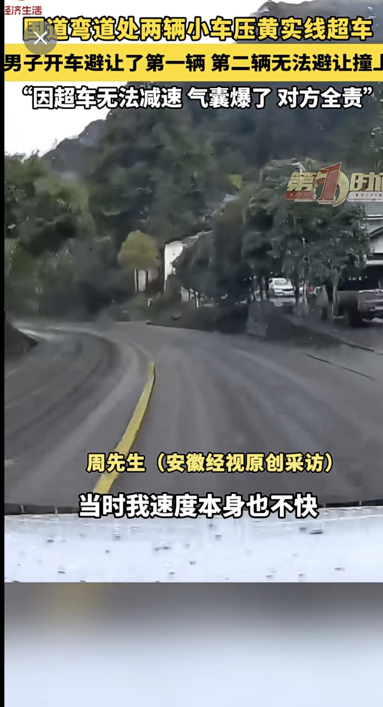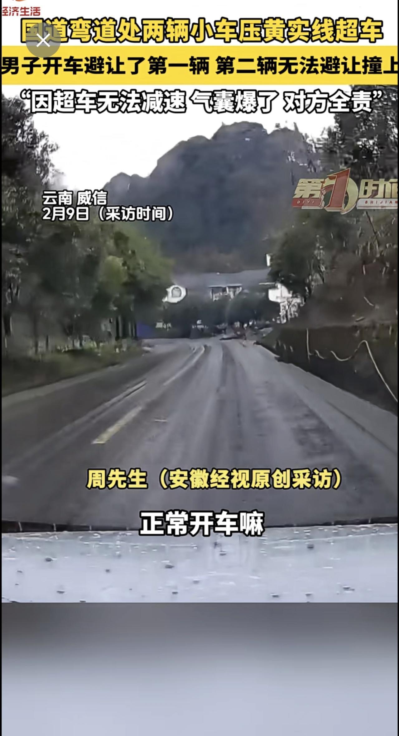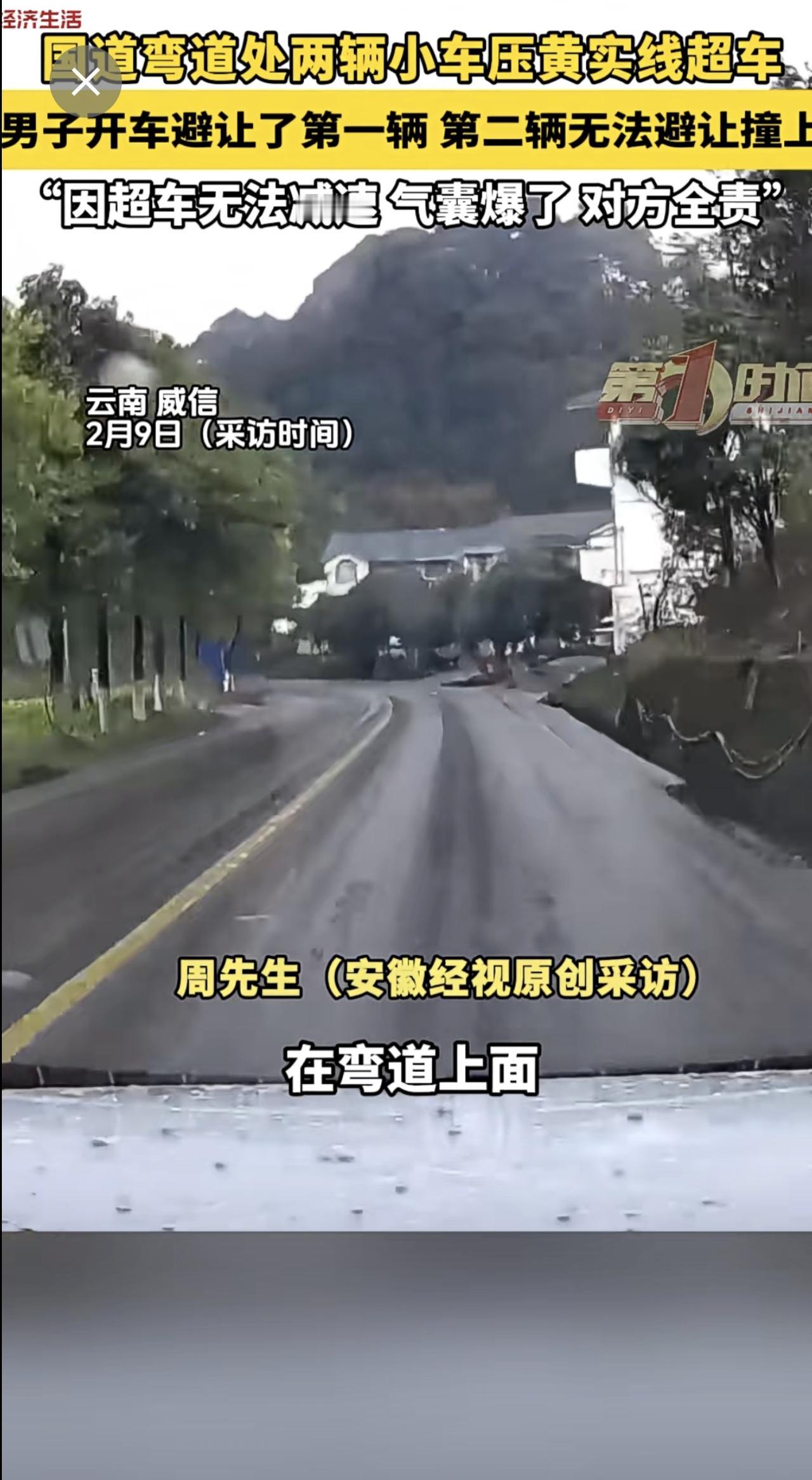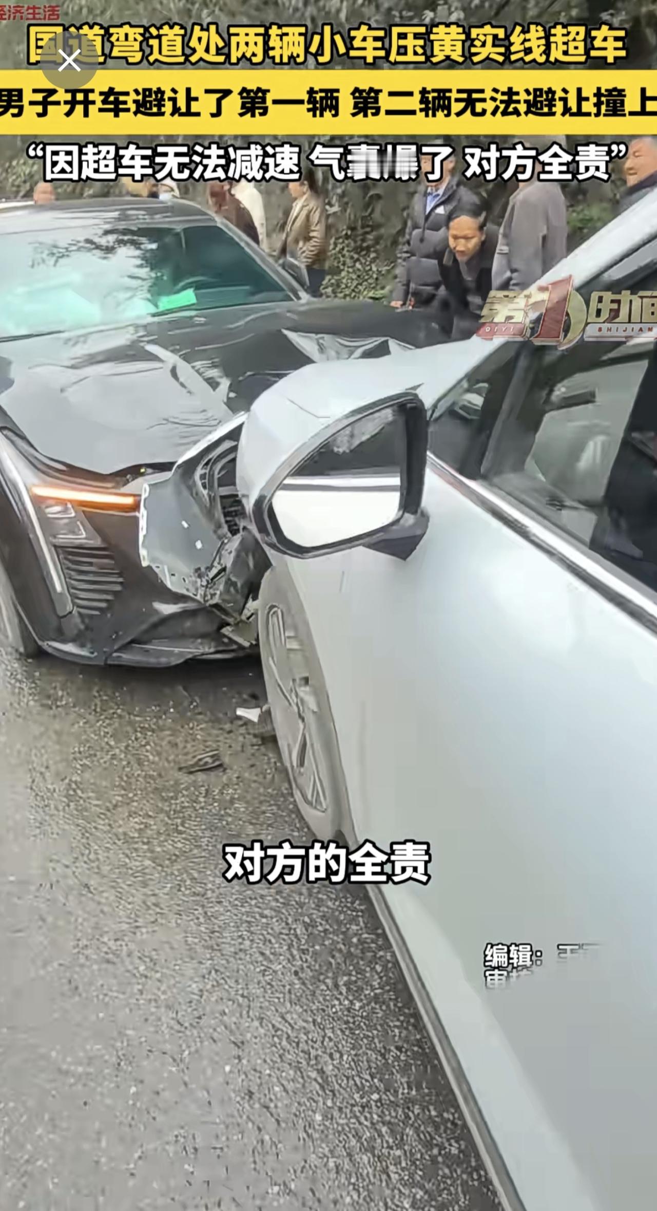 国道弯道处两辆小车压黄实线超车,男子开车避让了第一辆,第二辆无法避让撞上。交通事故