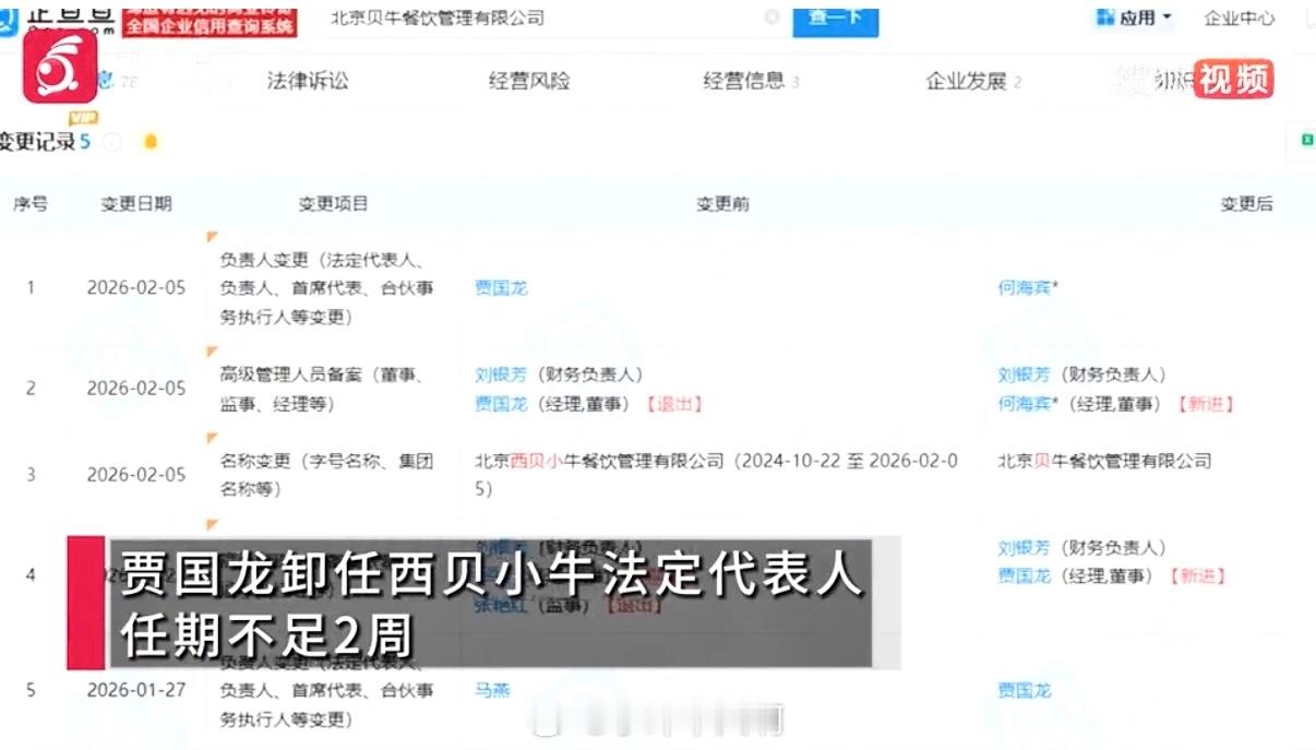 贾国龙卸任西贝小牛法人代表近日,北京西贝小牛餐饮公司更名为“贝牛餐饮”,贾国龙在任职不到两周后迅速卸任法人、董事等职务,由何海宾接替。股权结构未变,仍由西贝集团和贾国龙关联公司控股。此次变动并非普通工商调整,而是西贝在经历预制菜风波、业绩下滑和大规模关店后的主动改革。贾国龙已多次表示要“回归一线、聚焦主业”,减少个人曝光,专注产品与供应链。