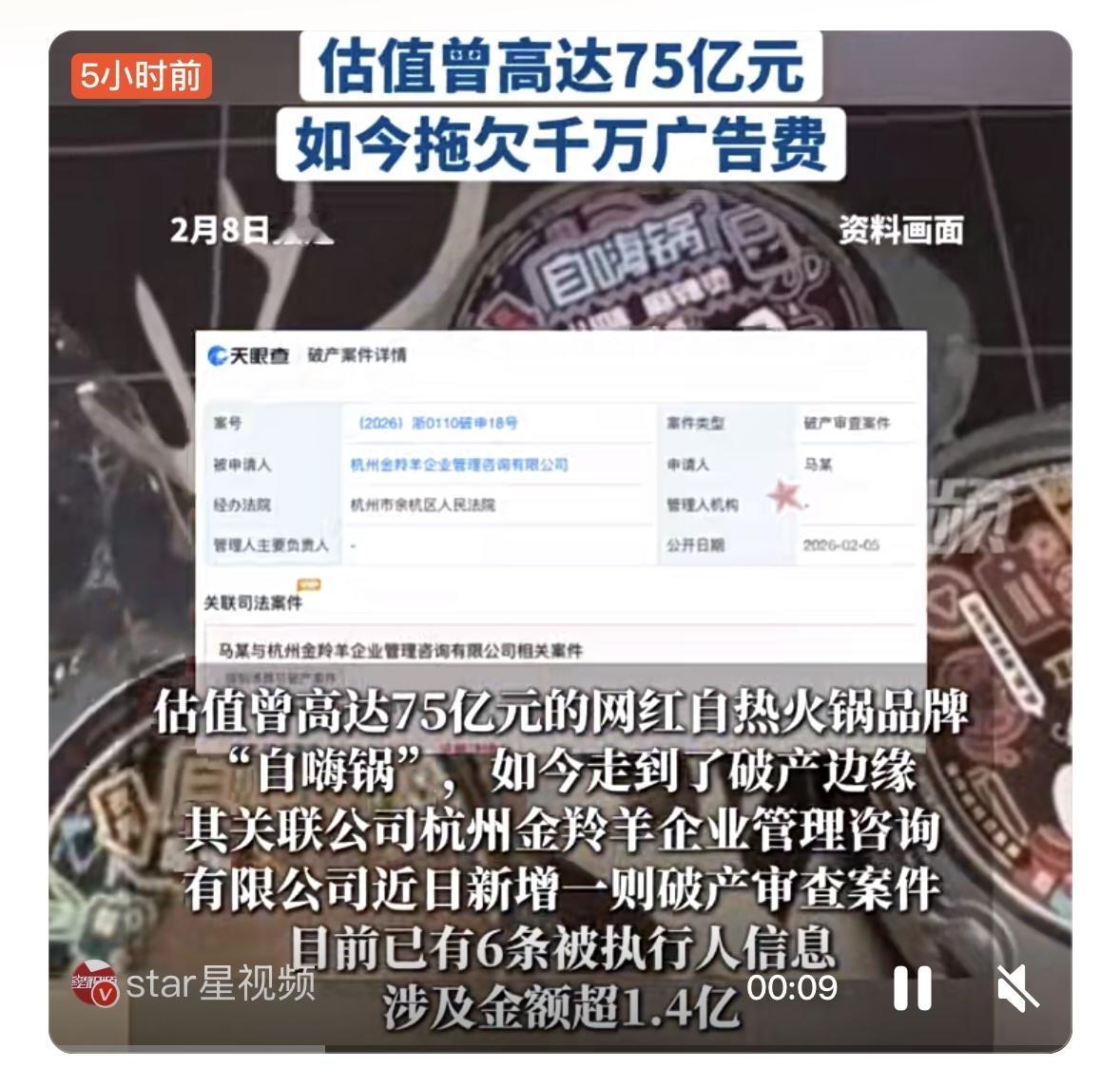 曾估值75亿元的网红自热火锅品牌自嗨锅,其关联公司杭州金羚羊于2026年2月被申请破产审查。公司负债超1.4亿元,创始人被限制高消费;叠加行业降温、市场需求下滑、资本退潮,昔日消费赛道顶流已彻底陷入破产边缘。